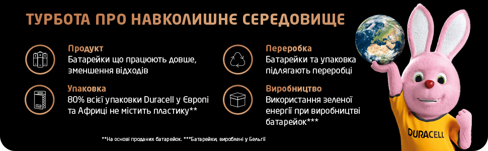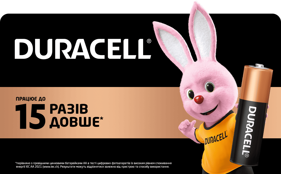 Технологія Duracell зберігає зарядженими ваші батарейки, що не використовуються, протягом 10 років, якщо вони зберігаються в оригінальній упаковці та у нормальних умовах середовища.