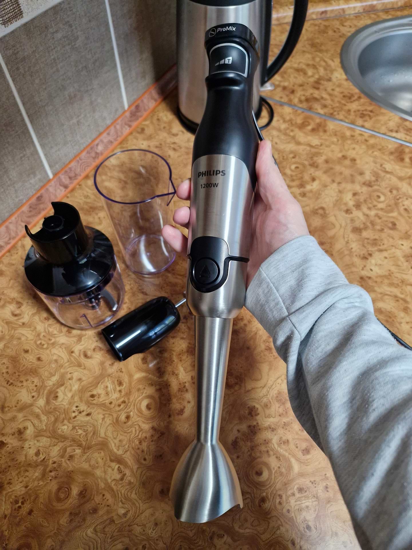 Вирішили купити блендер на заміну старому Philips ProMix NL 9206 AD-4 700 W, який працює ще відмінно, але редуктори вінчика і ножа, "покинули чат", а вартість нових така, як нового блендера. Вибирали між Philips і Braun, хоча консультант наполегливо:) рекомендував Bosh (нібито надійніший моторний блок). Сам блендер потужний, чудово лежить в руці, виглядає дуже солідно і якісно, чаша для подрібнення малувата, так що фарш зробити, мабуть, не вийде. Маю надію, що прослужить не менше, ніж попередній.