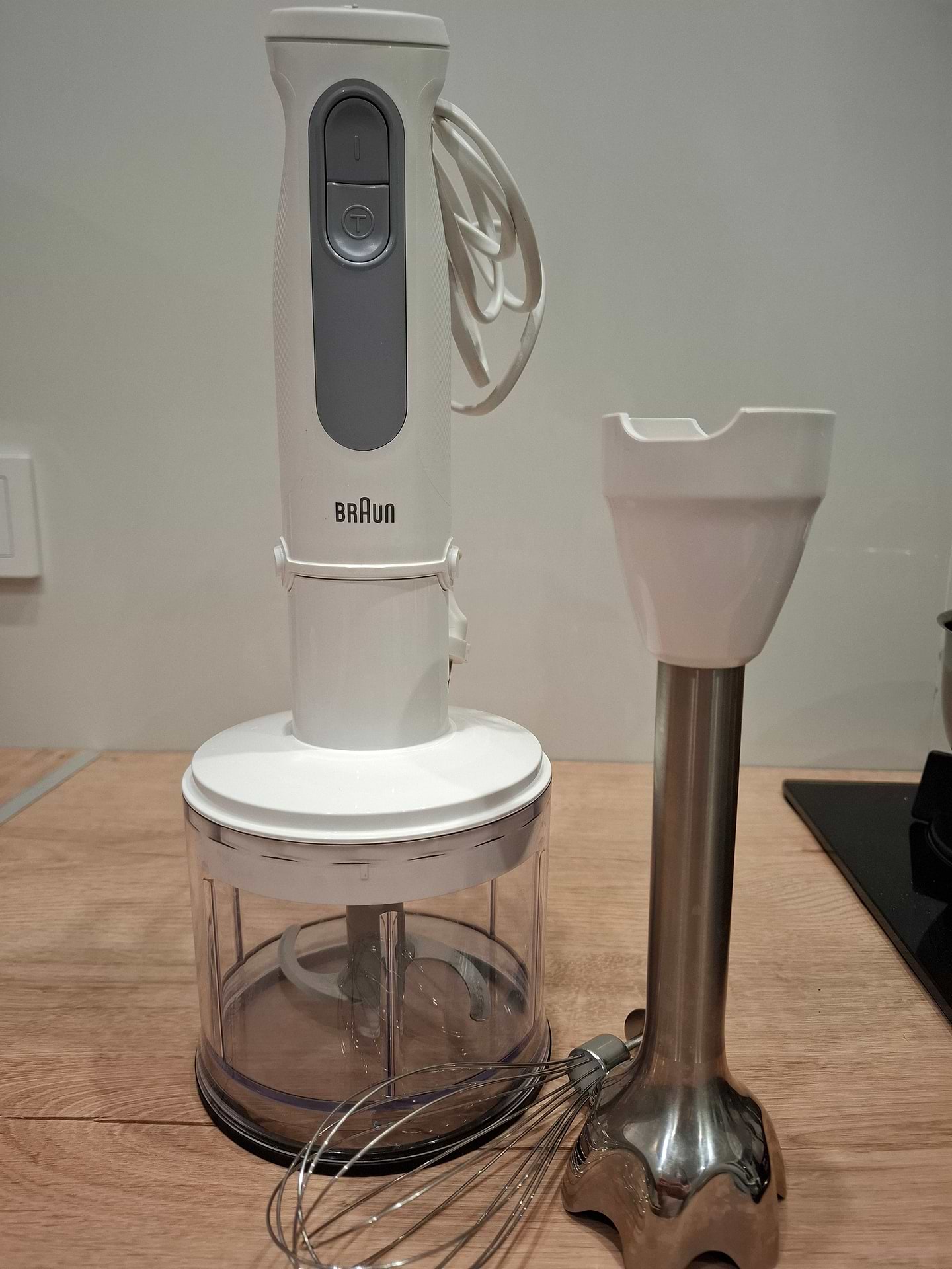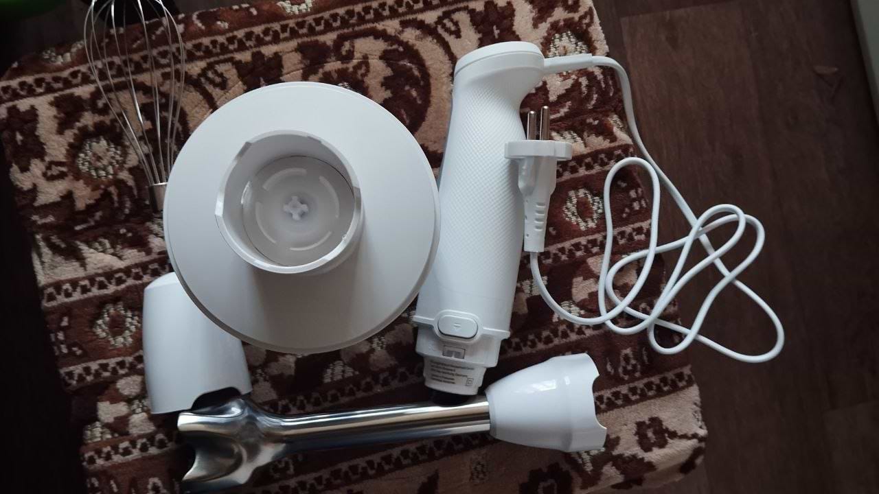 Крутий блендер. Працює тихо, велика потужність реально відчувається. Подрібнює все, м'ясо, картоплю, моркву без проблем. Смузі, суп- пюре, паштети, соуси це взагалі легко та швидко. Вінчиком збиваю тісто на кекси, млинчики, омлет. Зручно тримати в руці, велика кількість швидкостей, гострі леза. Укомплектований всім необхідним для зручного та легкого користування. Покупкою задоволена. Рекомендую!
