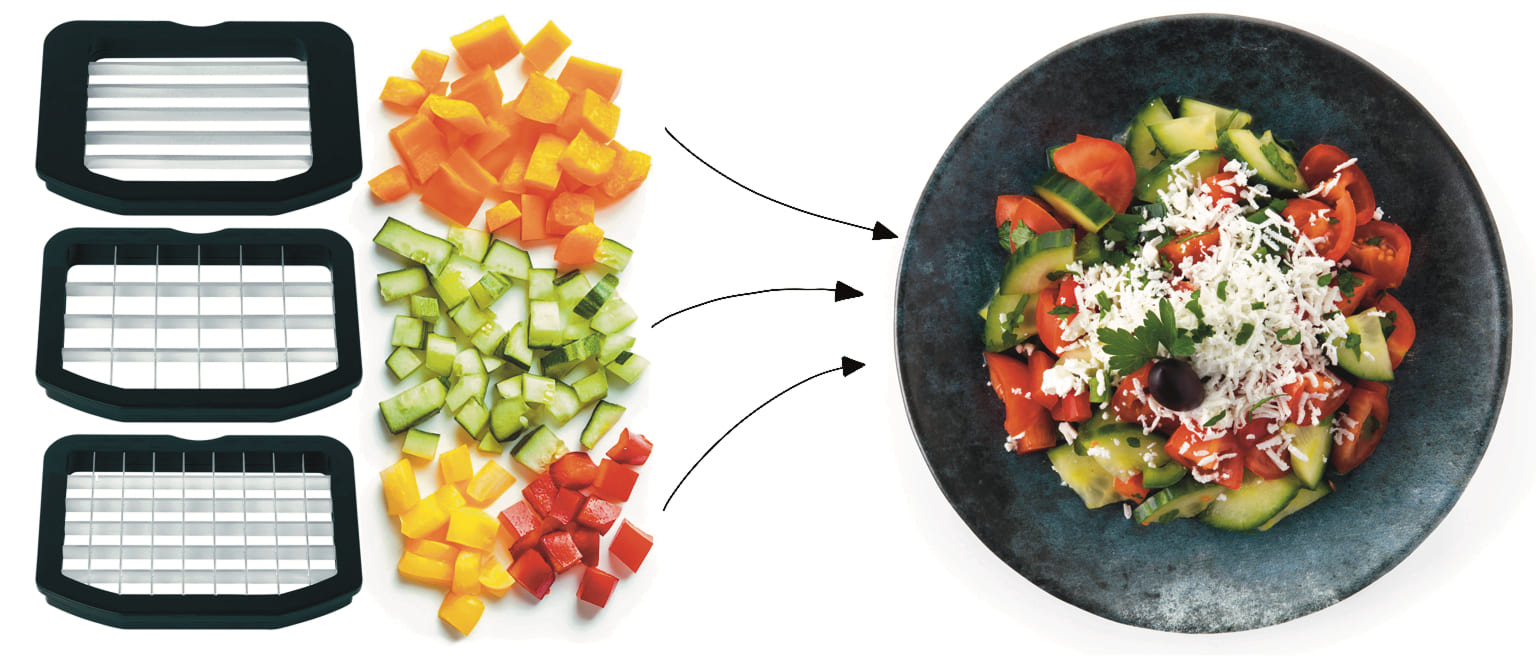 Насадка для нарізання кубиками (8×8 мм і 11×11 мм) допоможе швидко підготувати інгредієнти для салатів чи гарнірів. Простора пластикова чаша об’ємом 2 літри з гострим лезом забезпечує рівномірну нарізку, перетворюючи процес на легке й зручне завдання.