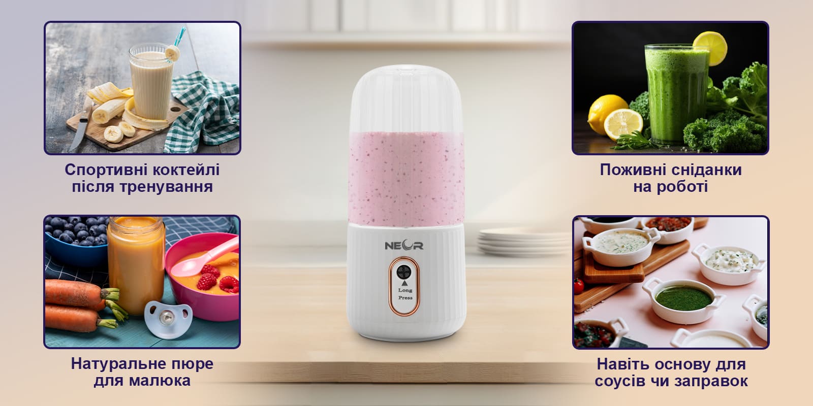 Набридли перекуси на ходу? Немає часу на повноцінний сніданок? NEOR JUICY — це твоє рішення. Просто закидай улюблені інгредієнти, натискай кнопку і насолоджуйся свіжим смузі, протеїновим коктейлем чи пюре просто в офісі, після тренування або на прогулянці.
