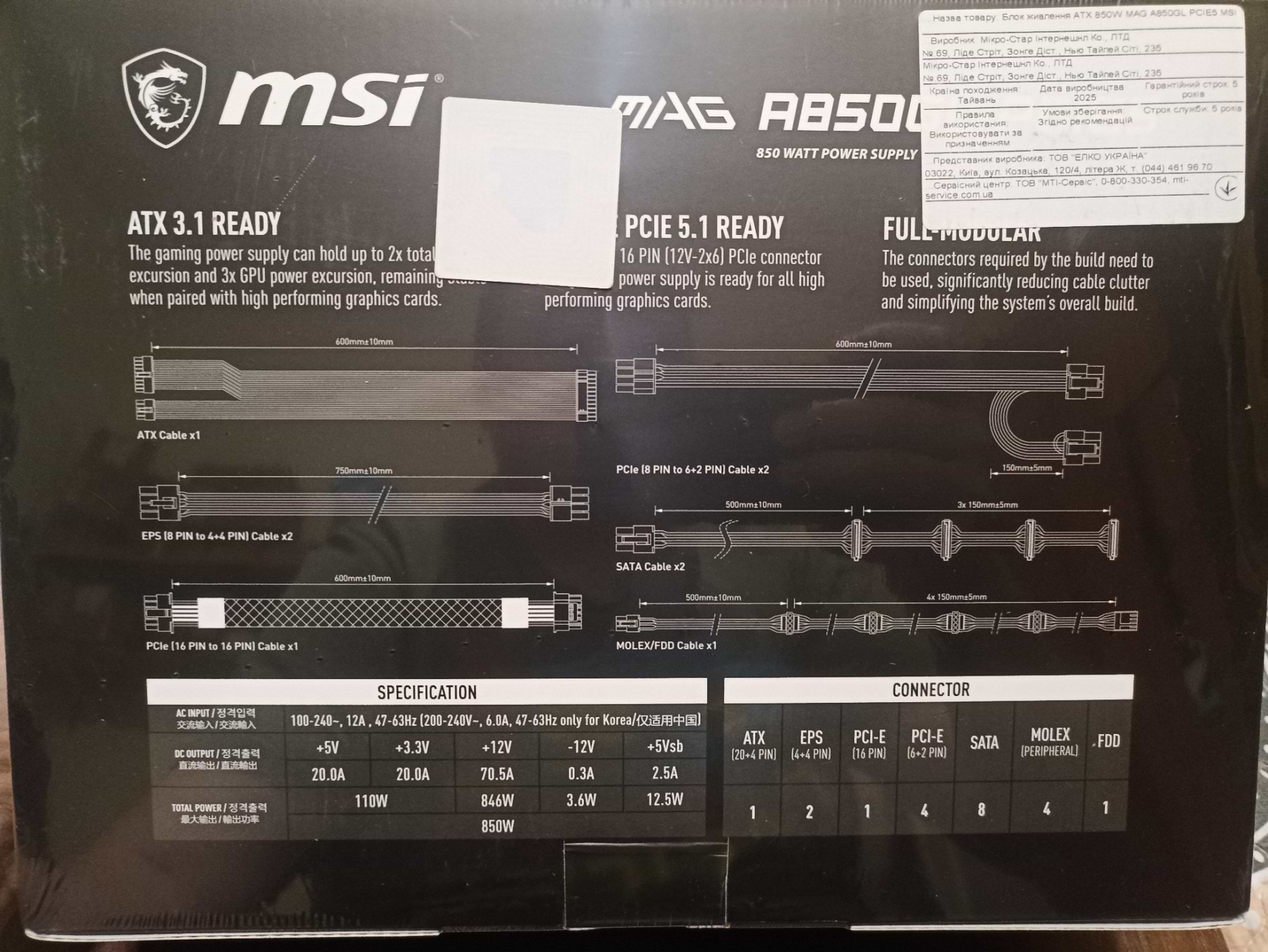 Блоком живлення повністю задоволений, модульний + має кабель PCIe 5.0, 600 вт