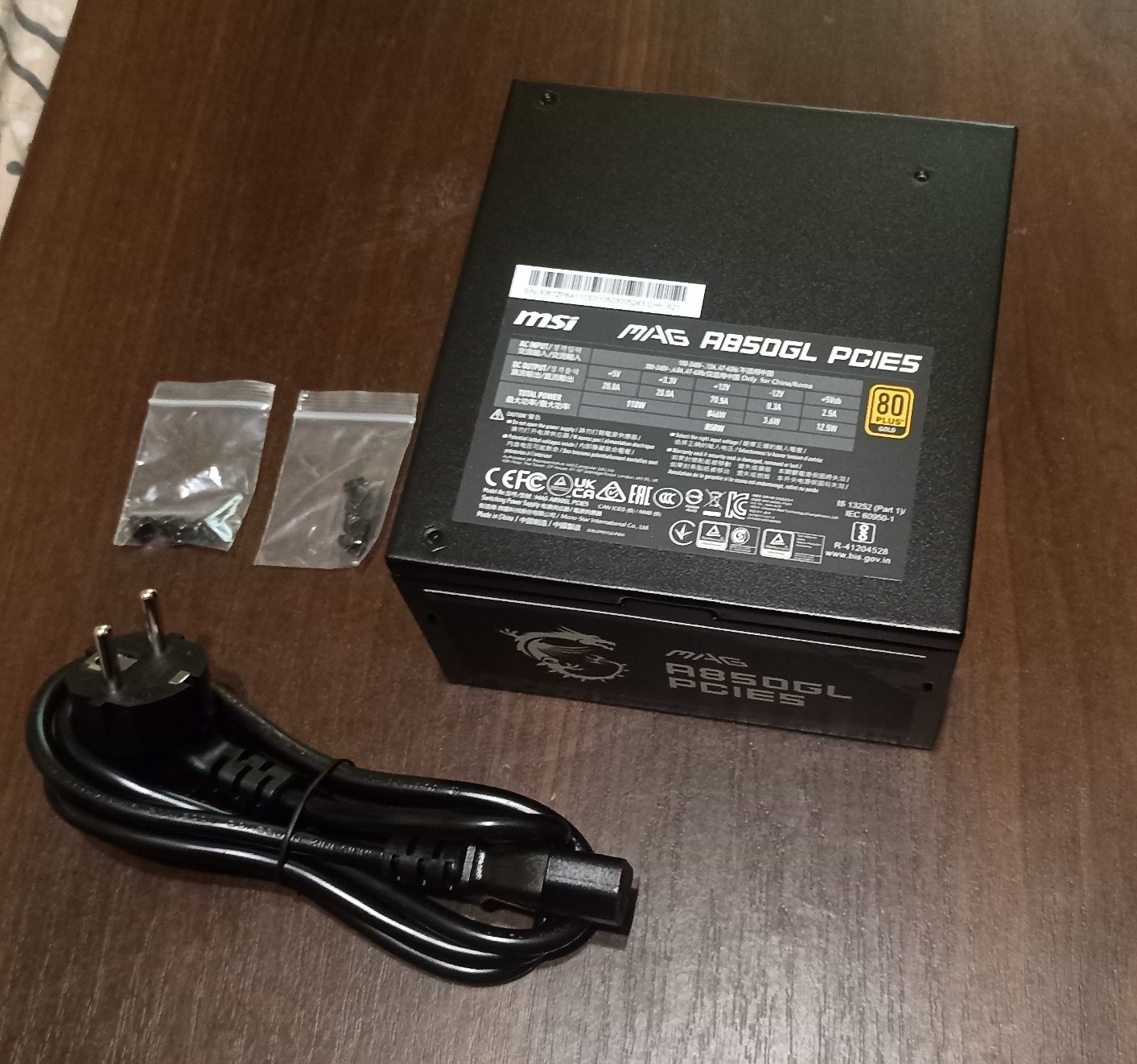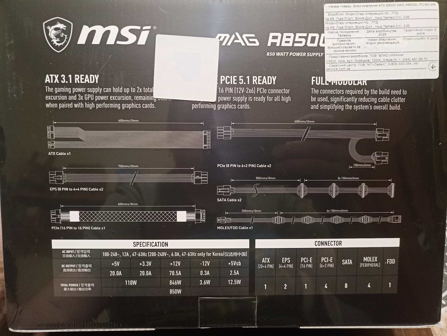Блок живлення для ПК MSI 850W 80 PLUS Gold (MAG A850GL PCIE5)