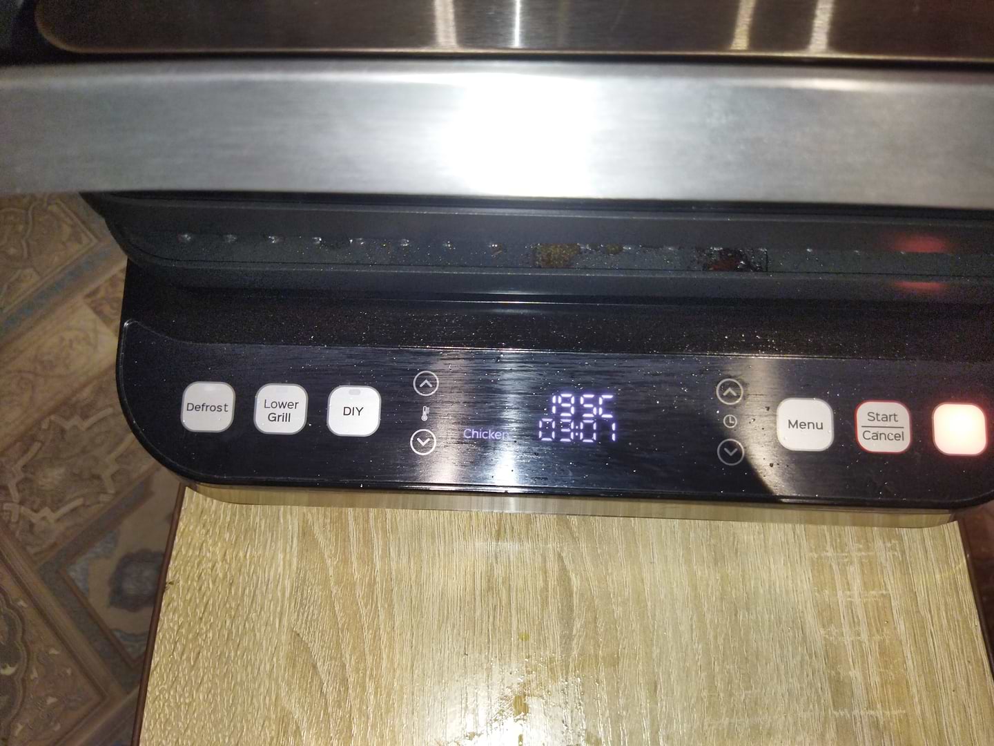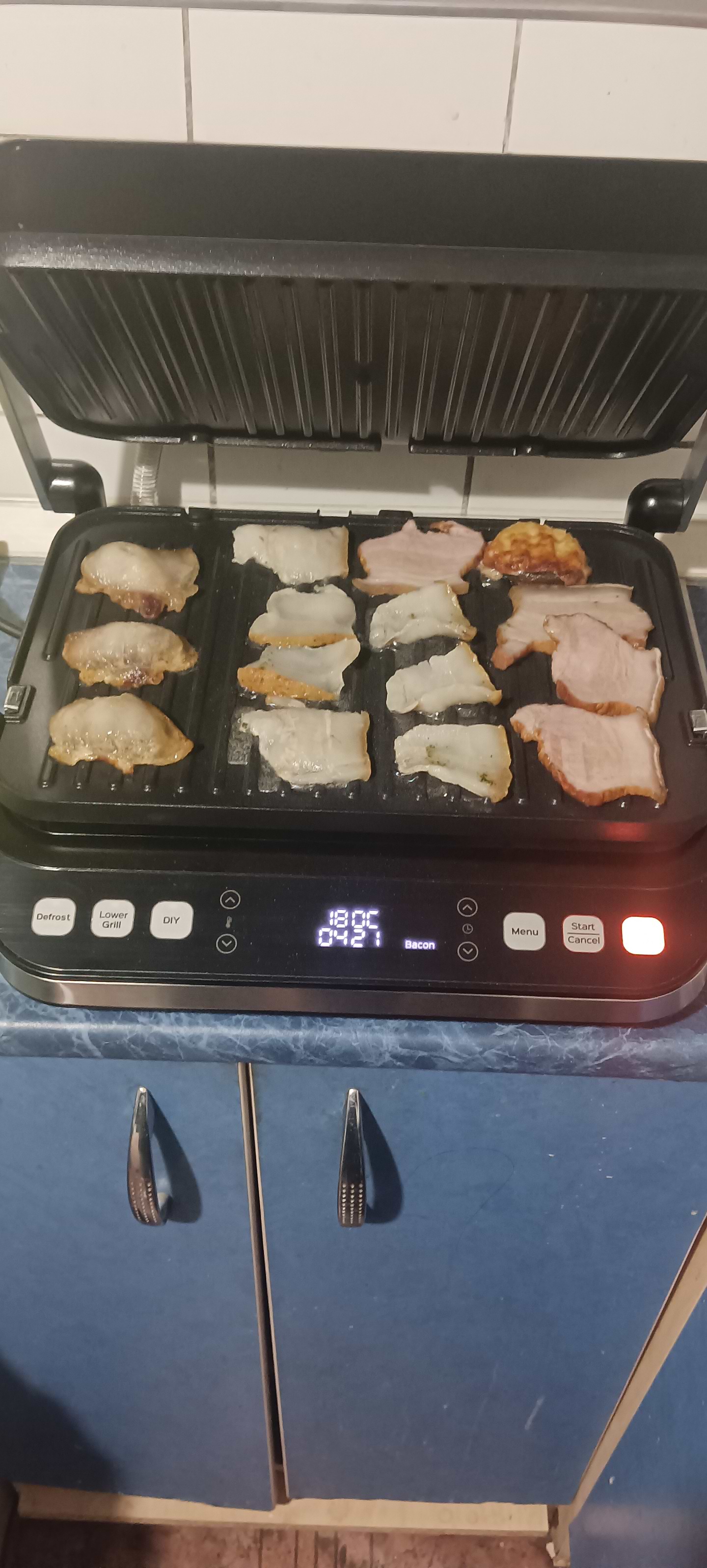 Шикарно готує будь які види м'яса, риби, креветки дуже смачні виходять. Ми за пару місяців перепробували всі види продуктів приготовлені на ньому, зараз нагетси готуємо - це дуже швидко, з мін олії, велика кількість відразу готується. Гриль має ще декілька речей які потрібно згадати, панелі в нього двохсторонні і змінні, легко миються, взагалі нічого не шкрябаю і не тру, просто намилила миючим засобом та змила, ну і дисплей теж легко мити, бо буває, що краплі жиру потрапляють і туди.
