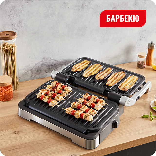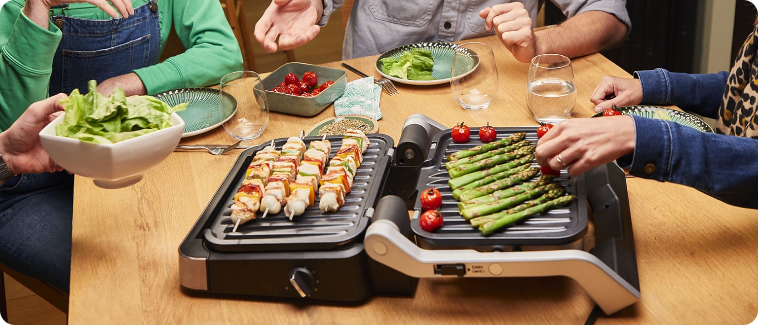 Отримайте більшу площу для приготування та влаштуйте барбекю прямо посеред стола. При відкриванні грилю на 180С, 4х позиційний термостат підтримує однакову температуру з обох сторін. Перетворіть вечерю з друзями на цікаву та смачну розвагу.