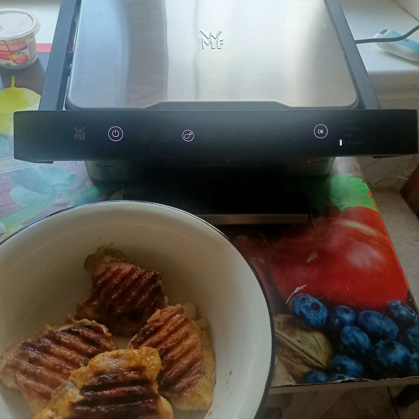 Компанія WMF - це преміум рівень. Якість, зовнішній вигляд на найвищому рівні. Після покупки готуємо тільки на ньому, мясо, курку, рибу, картоплю. Також пробували моркву і буряк. Чудово, смачно, швидко. Ніякого масла. Мити просто, відстегнув дві пательні і витягнув піддон для збору жиру. Клас