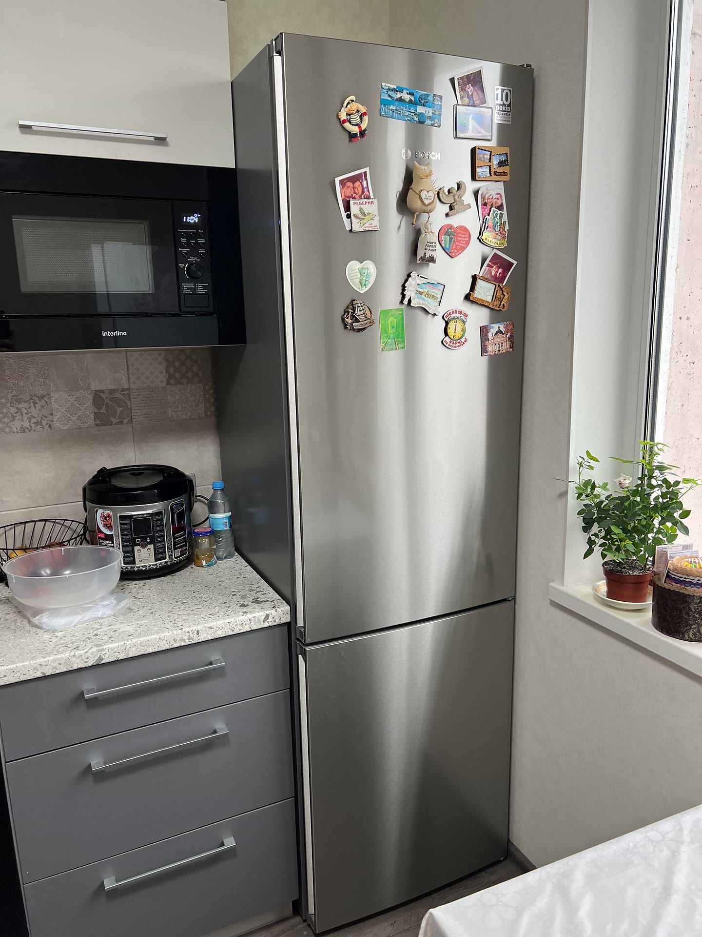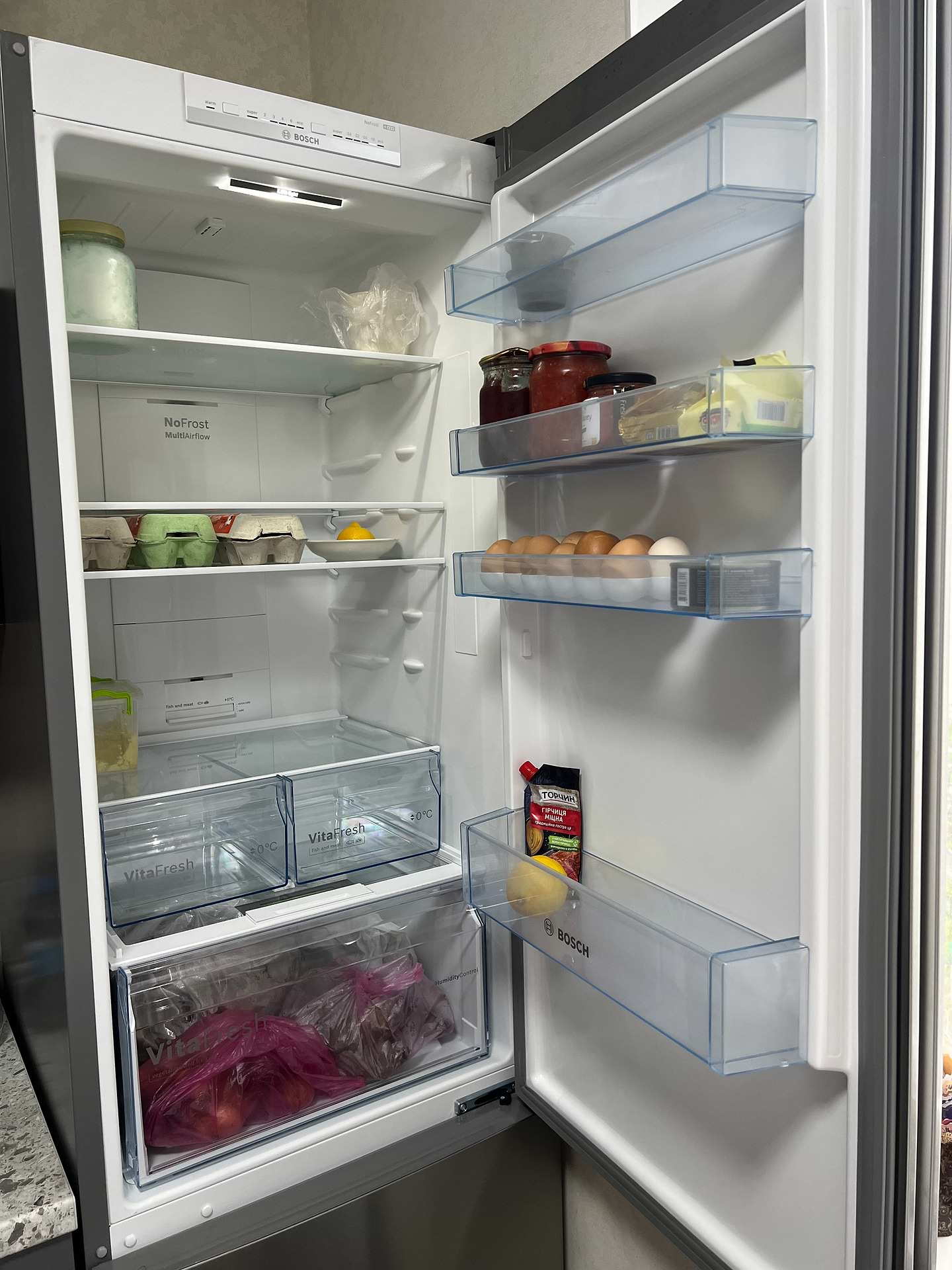 Покупкой очень довольны, рассматривали разные варианты. Bosch понравился по всем параметрам - отличный дизайн, на фасаде качественная нержавейка, большая холодильная и морозильная камеры. Полки переставляются по высоте, много вариантов под высоту разной посуды.Есть возможность хранить мясо и рыбу в охлаждённом состоянии, блюда получаются вкуснее и сочнее по сравнению с приготовлением из замороженных продуктов. Порадовал большой бокс под овощи и фрукты, много помещается и долго хранится. Болшая морозилка, есть три ящика, можно вынять один или два на случай, если нужно разместить что-то крупное из продуктов. Хороший холодильник, от души рекомендую!