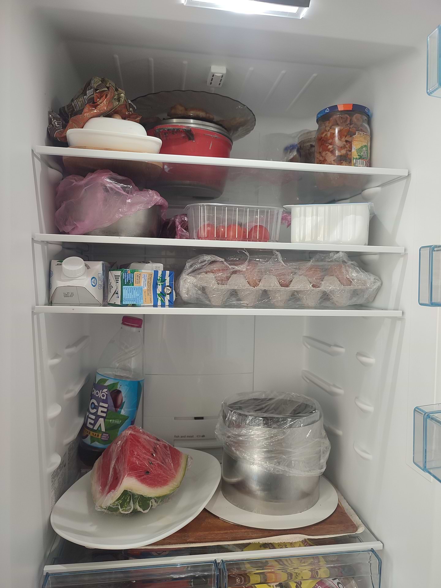 Загалом холодильник хороший, є окремий відділ під м'ясо де нижча температура (-4) та зручні полички які можна підсунути якщо вам незручно, з поганого це я думаю дуже великий ящик під овочі та фрукти, враховуючи що пластик розрахований на кілограм 5 ваги а в нього можна загрузити до 10 кг. Якби ящик був коротший то на дверях могла спокійно поміститися поличка під воду чи олію