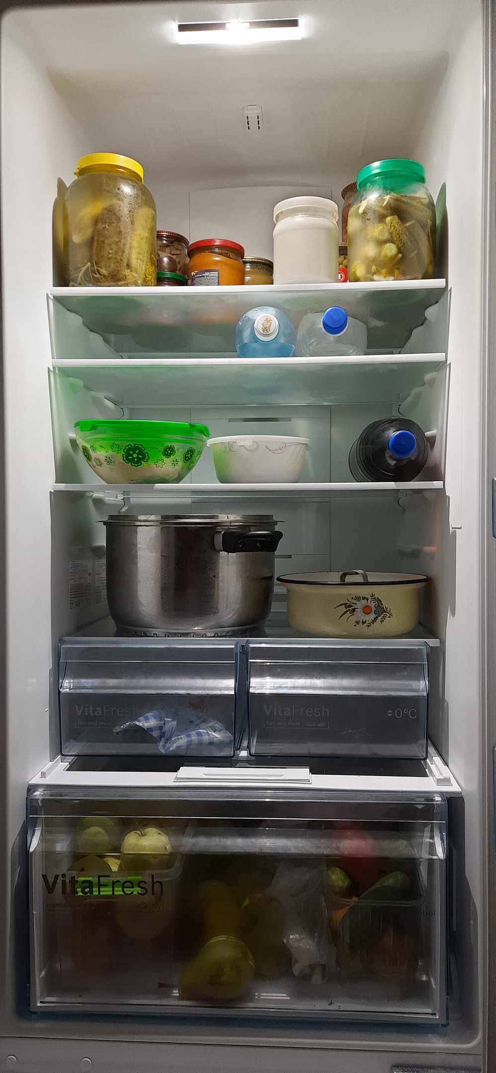 Працює тихо. Є дві шухляди фреш-зони для м'ясних і рибних продуктів та великий місткий ящик для овочів.