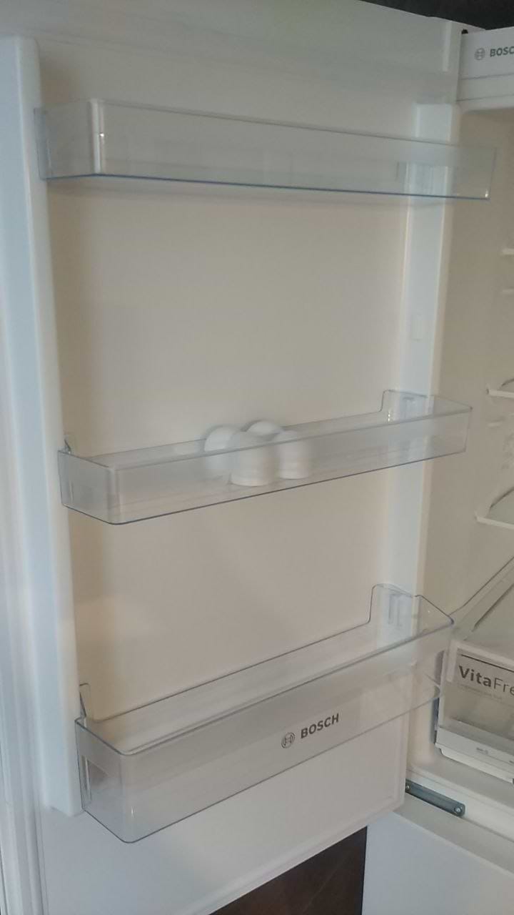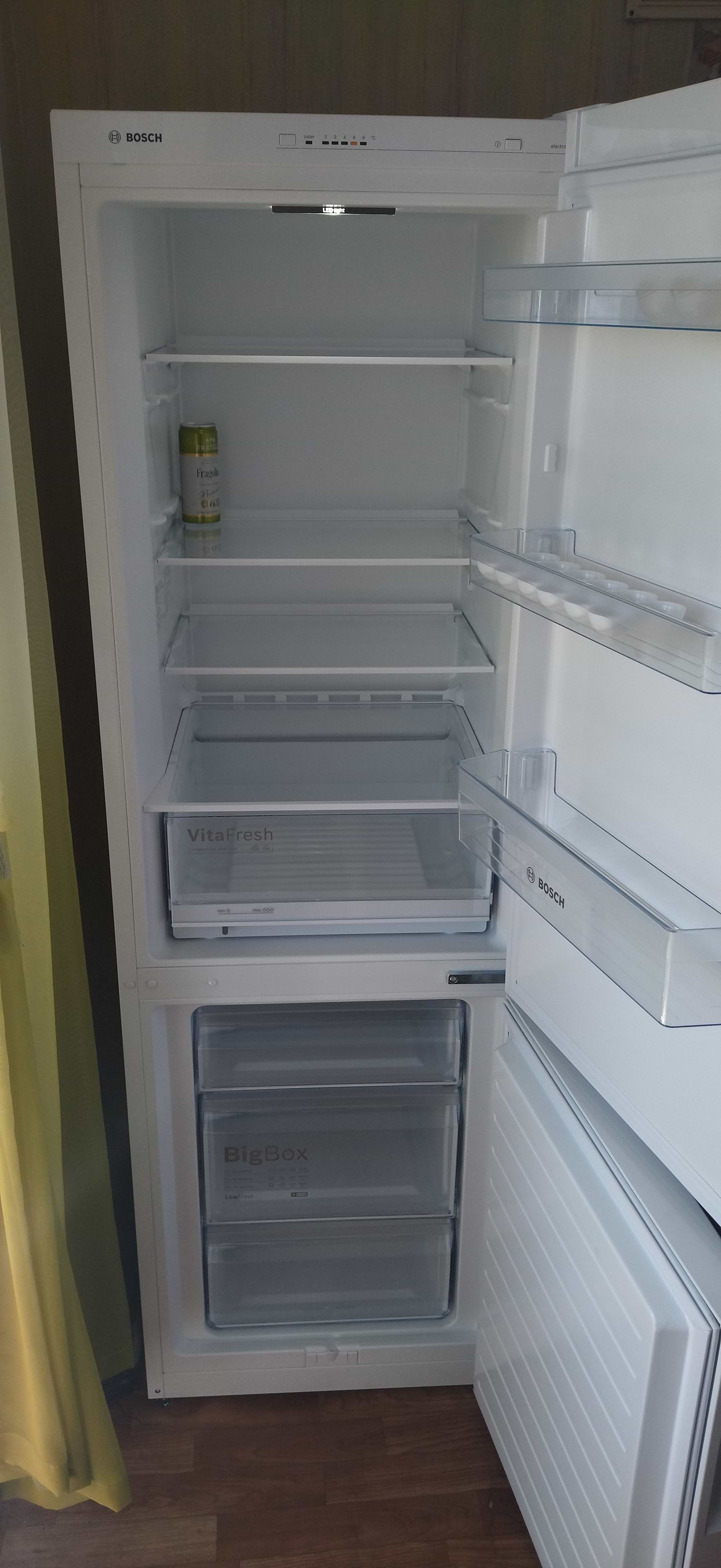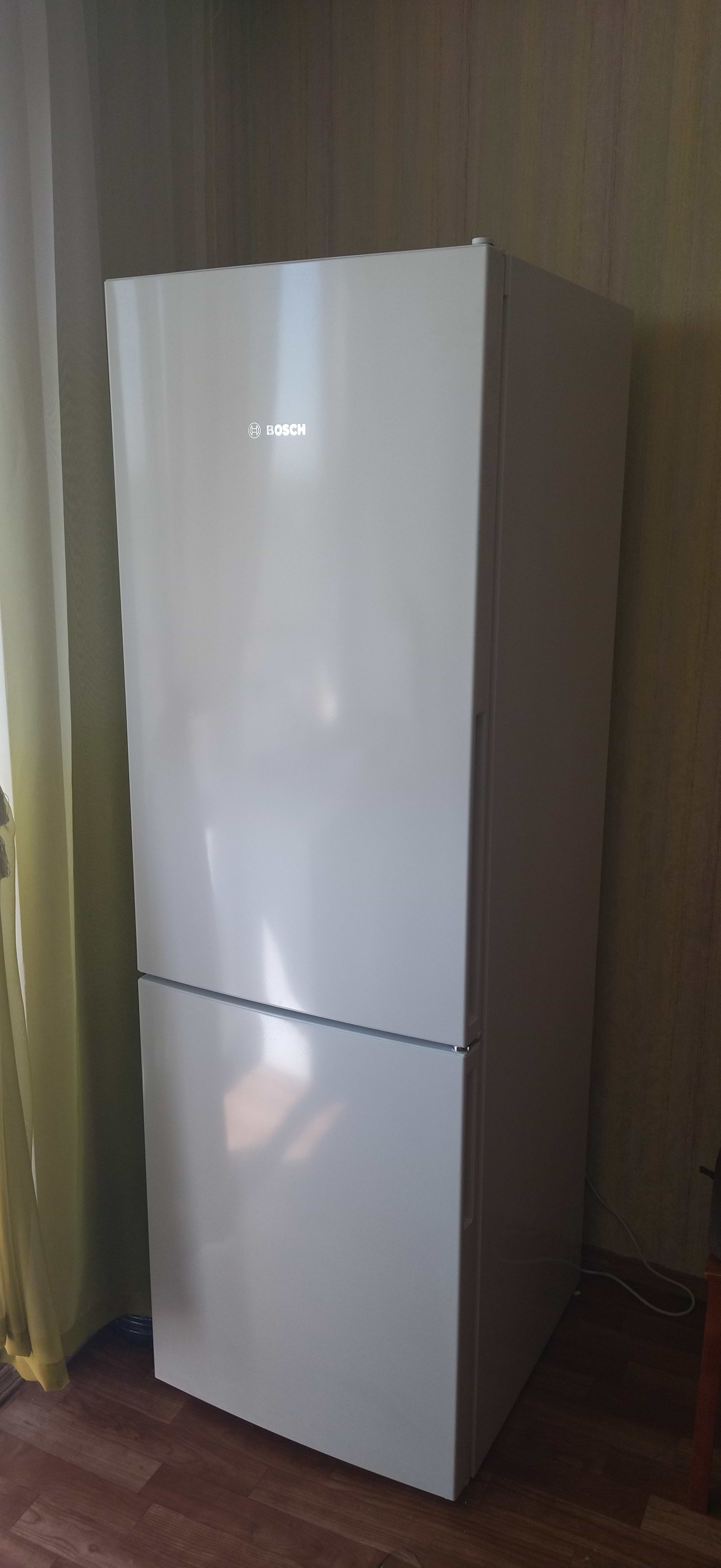 Холодильник Bosch Kgv36uw206 в общем понравился. При температуре+4гр. в холодильнике, и в жару 32гр хорошо морозит и сохраняет холод. Полочки ударопрочные из хорошего пластика. В холодильное отделение помещается одна большая кастрюля советского типа. Энергопотребление А+ , уровень шума 41дб, но работает тихо. Система разморозки капельная, и в холодильном отделении иней сам отстаивает. В морозильном отделении иней тоже мало образуется, три вместительных контейнера под мясо, рыбу и др. продукты. В холодильник отделении есть вместительный контейнер для фруктов и овощей, но в нем не хватает отдельных отсеков, чтобы овощи и фрукты компактно бы размещались. В целом понравился.