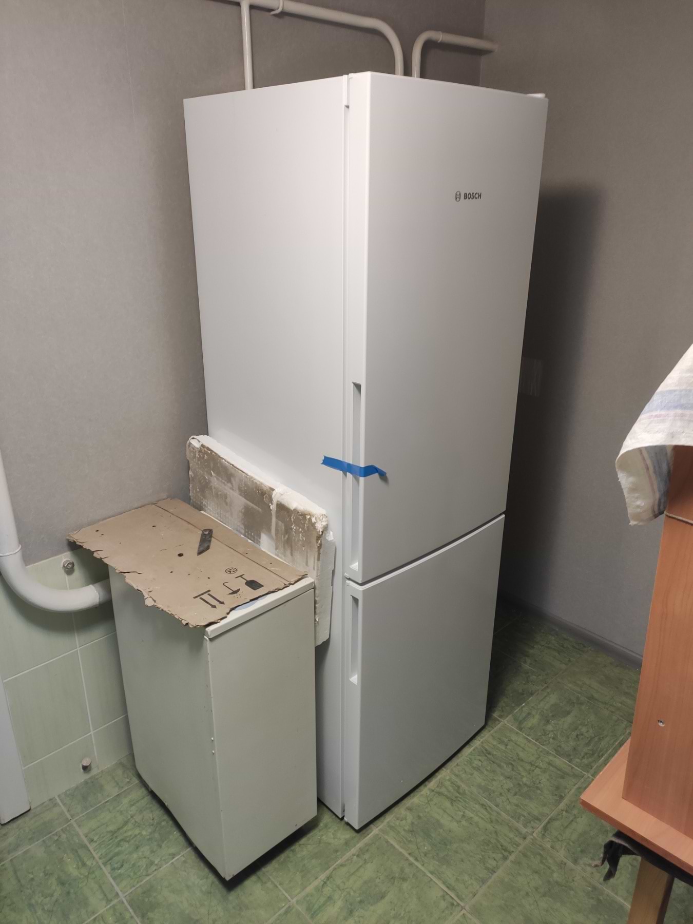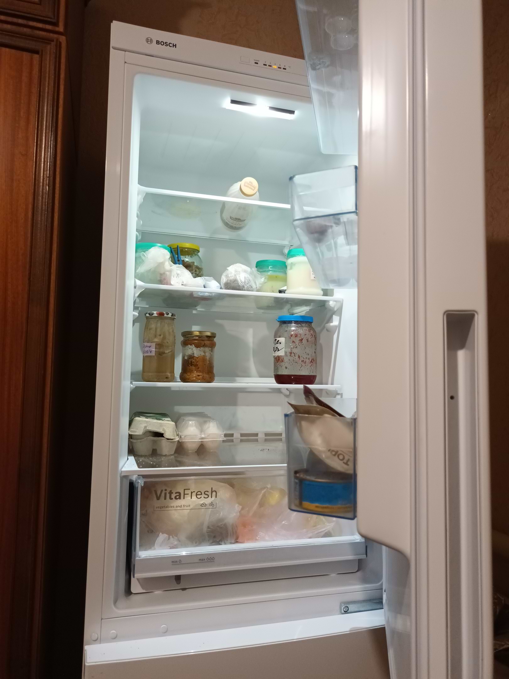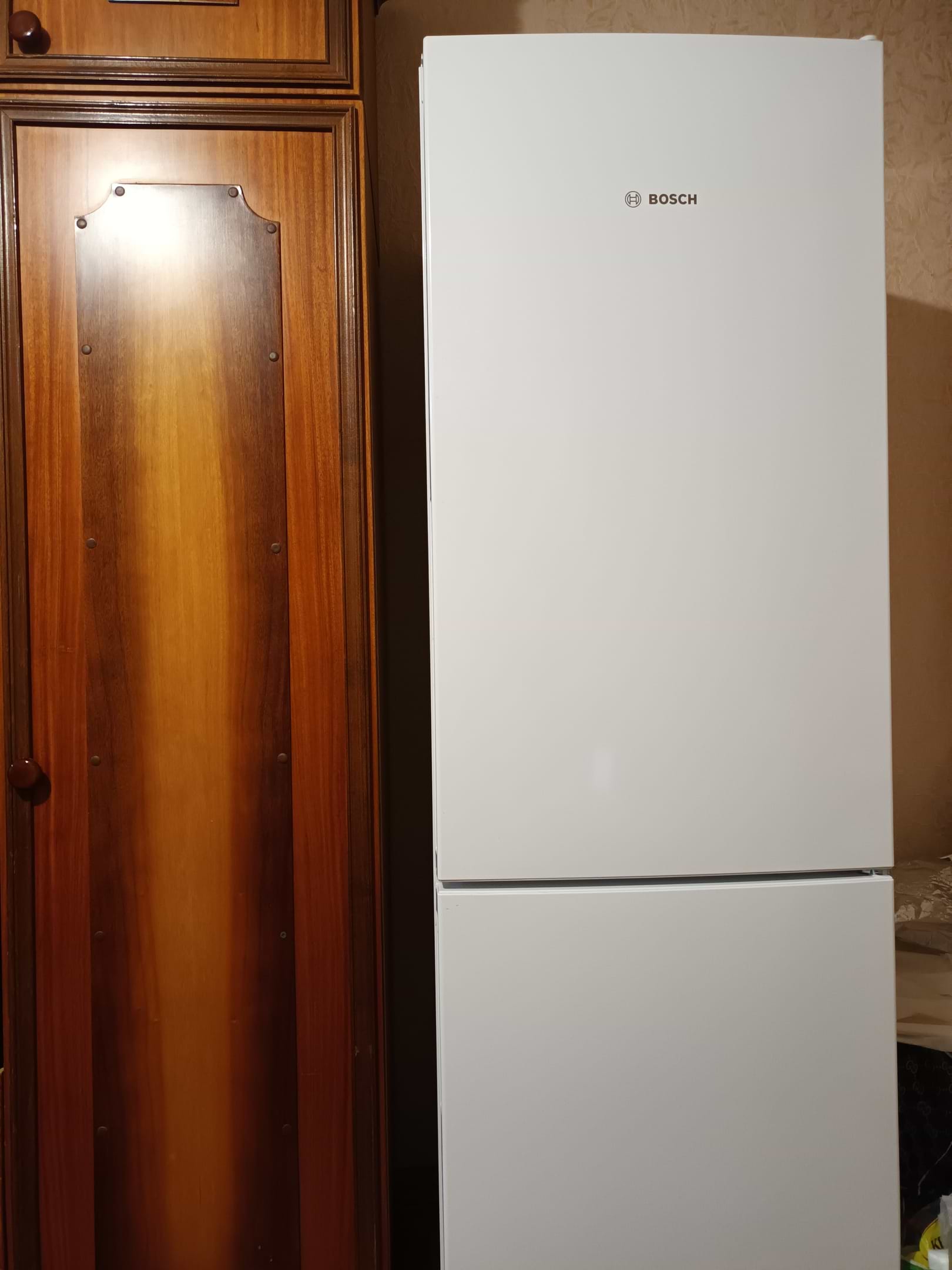 Холодильник Bosch Kgv36uw206 в общем понравился. При температуре+4гр. в холодильнике, и в жару 32гр хорошо морозит и сохраняет холод. Полочки ударопрочные из хорошего пластика. В холодильное отделение помещается одна большая кастрюля советского типа. Энергопотребление А+ , уровень шума 41дб, но работает тихо. Система разморозки капельная, и в холодильном отделении иней сам отстаивает. В морозильном отделении иней тоже мало образуется, три вместительных контейнера под мясо, рыбу и др. продукты. В холодильник отделении есть вместительный контейнер для фруктов и овощей, но в нем не хватает отдельных отсеков, чтобы овощи и фрукты компактно бы размещались. В целом понравился.