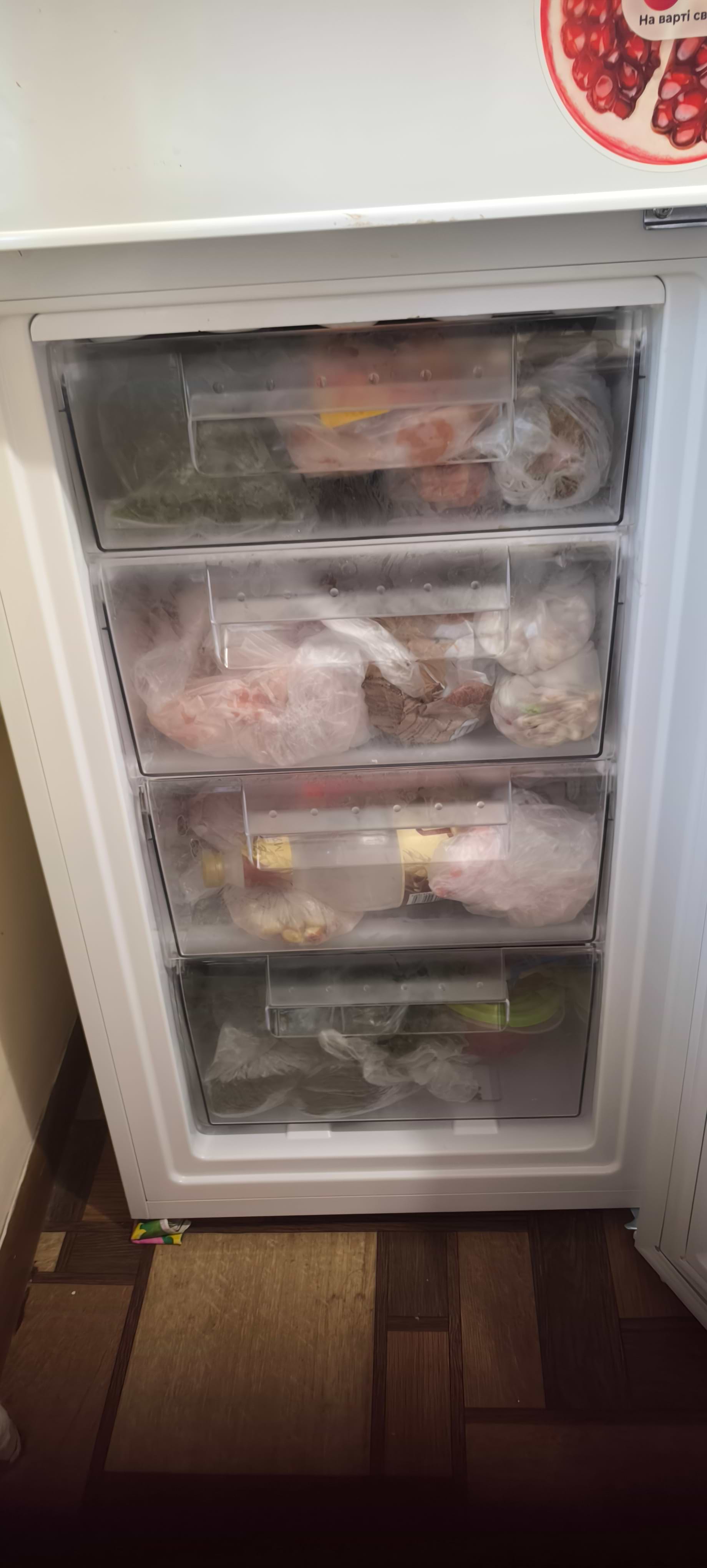 Холодильник чудовий! Наша сім'я задоволена ! Холодильник був ідеально запакований, пошкоджень не має, запустили і вразили дві речі: тихий звук роботи і майже зразу начало все холодити. Морозильна камера розділена на чотири відділення, дуже вмістка і дуже зручне нижнє розташування. У верхньому холодильному відсіку відділення міняються по висоті, що також дуже зручно. В дверях три досить вмістких кошики, є полиця для пляшок, 2-х літровки стають впевнено. Приємно, що клас енергоспоживання холодильника А+. І саме головне, це 30 місяців офіційної гарантії від виробника ! Покупкою задоволені, рекомендуємо ! З повагою, Володимир )