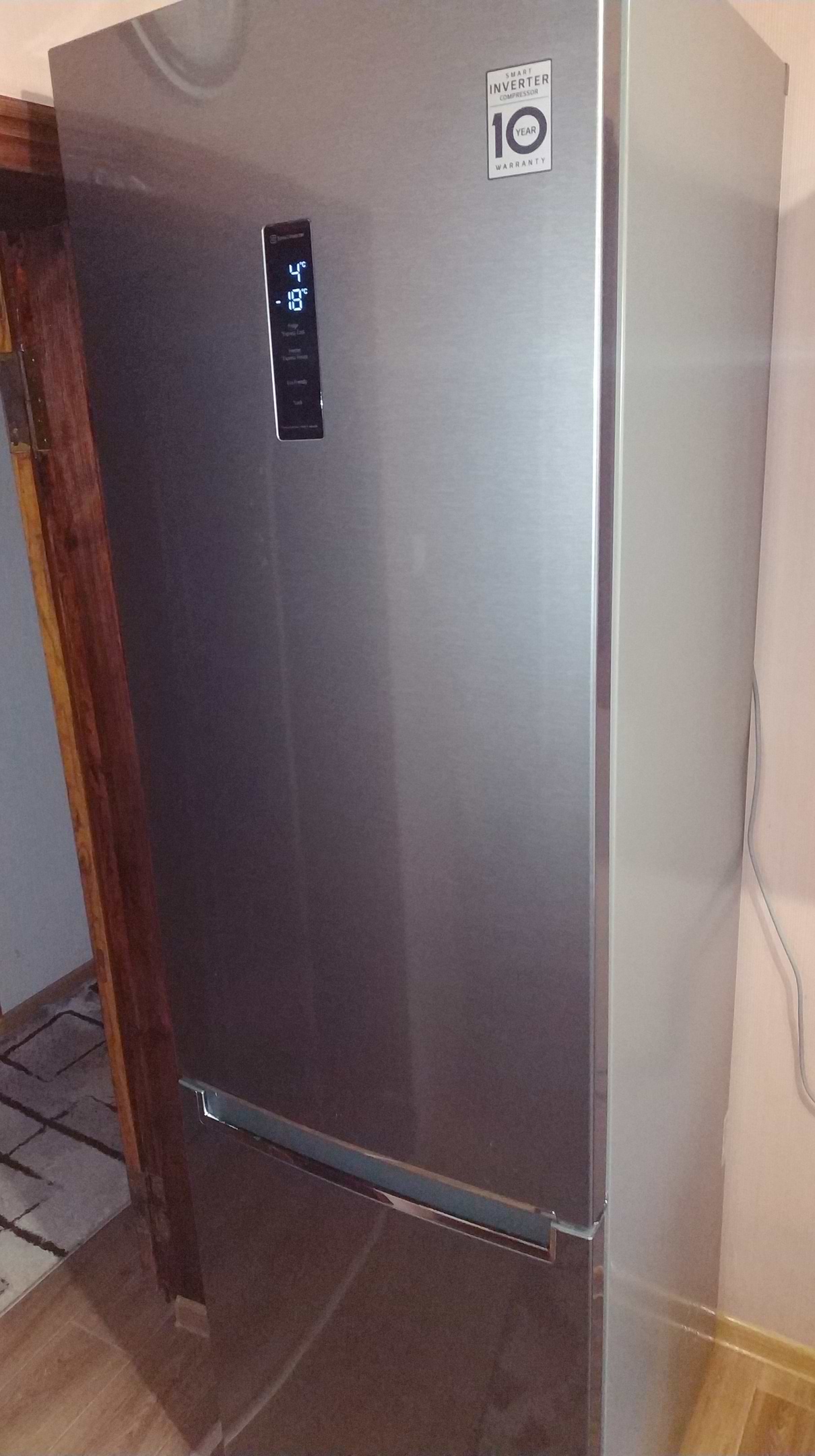 Холодильник с инверсионным компрессором, поэтому работает очень тихо. Есть складная полка, теперь поставить большую кастрюлю не проблема. Удобный сенсорный экран, для выставления отдельно температуры холодильника и морозильной камеры.