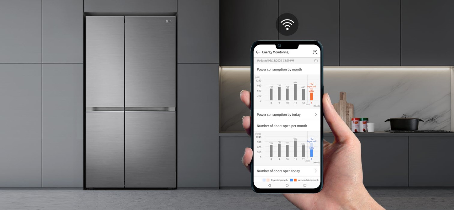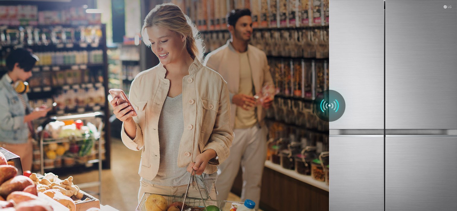 Технологія Wi-Fi c підключенням до ThinQ™ допоможе регулювати температуру у Вашому холодильнику в будь-який час і з будь-якої відстані. Ви можете налаштувати параметри температури та контролювати Ваш холодильник за допомогою гаджетів в режимі онлайн, а також отримувати повідомлення про неполадки.