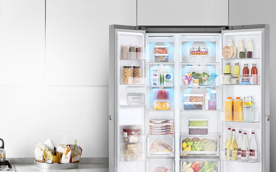 На 19,7%* більш швидке та рівномірне охолодження в будь-якому відсіку холодильника Технологія DoorCooling + забезпечує циркуляцію холодного повітря з верхньої частини холодильника, щоб підтримувати однакову температуру навіть у важкодоступних зонах. Це значно зменшує перепад температур між дверима та внутрішнім простором холодильної камери, та дозволяє зберігати свіжими усі продукти.