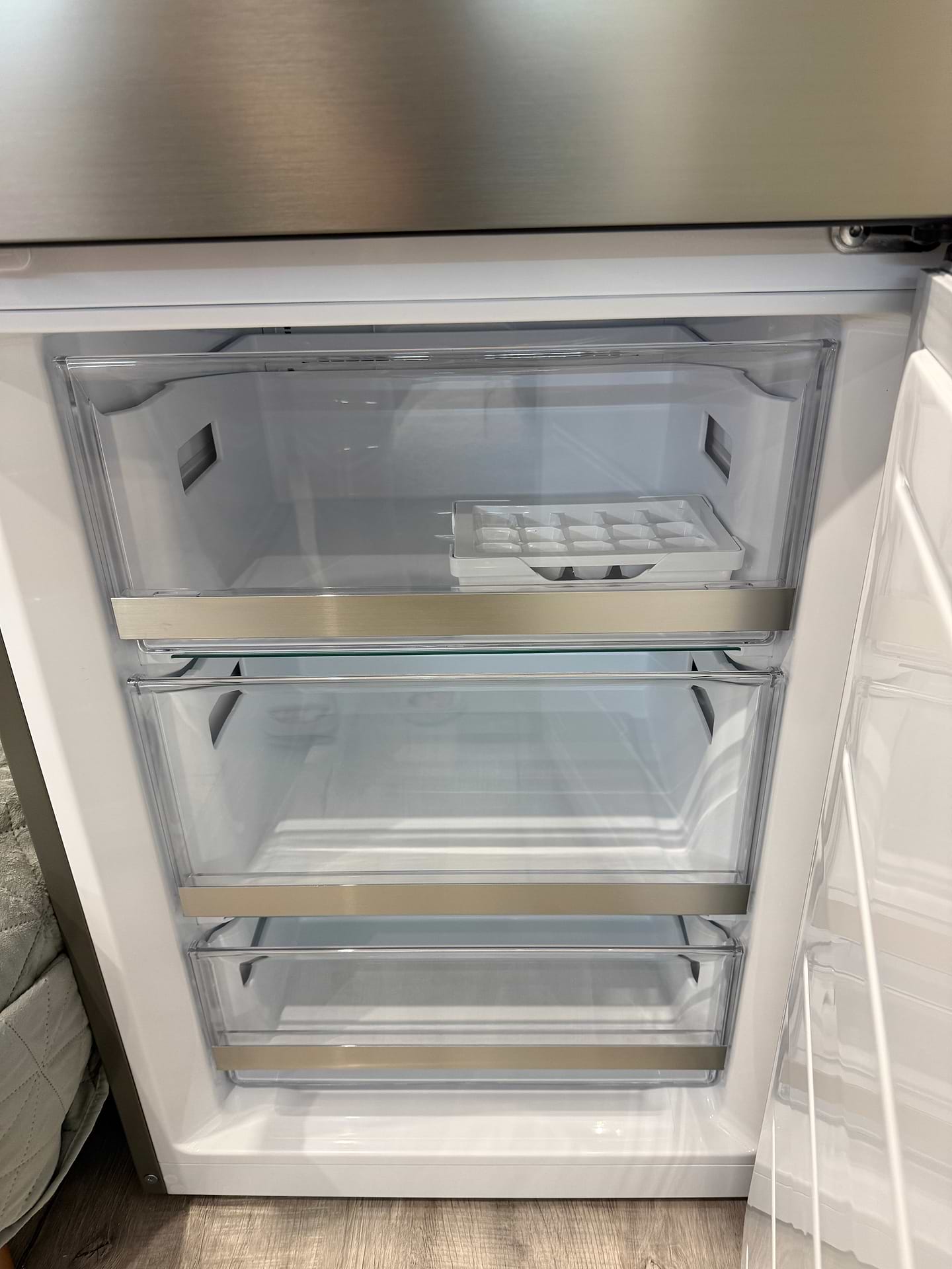 Новий холодильник з нижньою морозильною камерою - це втілення функціональності і стилю в елегантному корпусі. Мінімалістичний дизайн підкреслює елегантність і зручність.