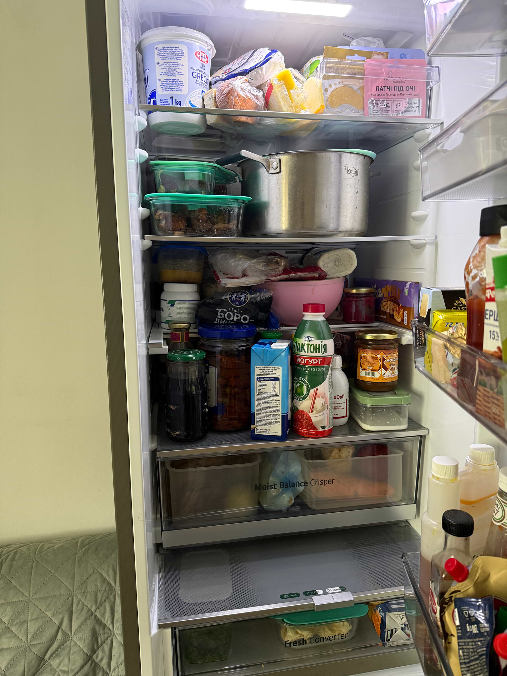 Завдяки комірчастій структурі кришки Moist Balance Crisper конденсат накопичується в сотах, запобігаючи потраплянню крапель на продукти. У той же час вода повільно випаровується, створюючи оптимальний рівень вологості. Це дозволяє зберегти фрукти і овочі свіжими набагато довше при збереженні їх корисних властивостей і смакових якостей.