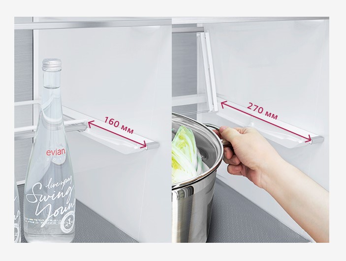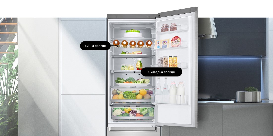Зручність зберігання та постійний порядок у холодильнику тепер легко досяжні завдяки полиці для вина та складаної полиці у два кроки, які допоможуть економно та ергономічно організувати простір у Вашому холодильнику.