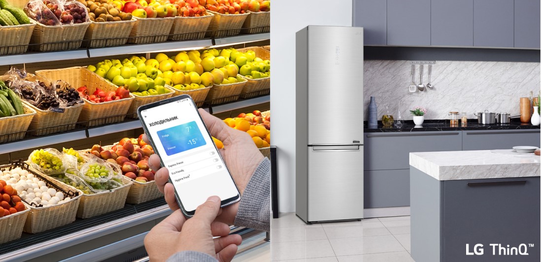 Технологія Wi-Fi c підключенням до ThinQ ™ допоможе регулювати температуру у Вашому холодильнику в будь-який час і з будь-якої відстані. Ви можете налаштувати параметри температури та контролювати Ваш холодильник за допомогою гаджетів в режимі онлайн, а також отримувати повідомлення про неполадки.