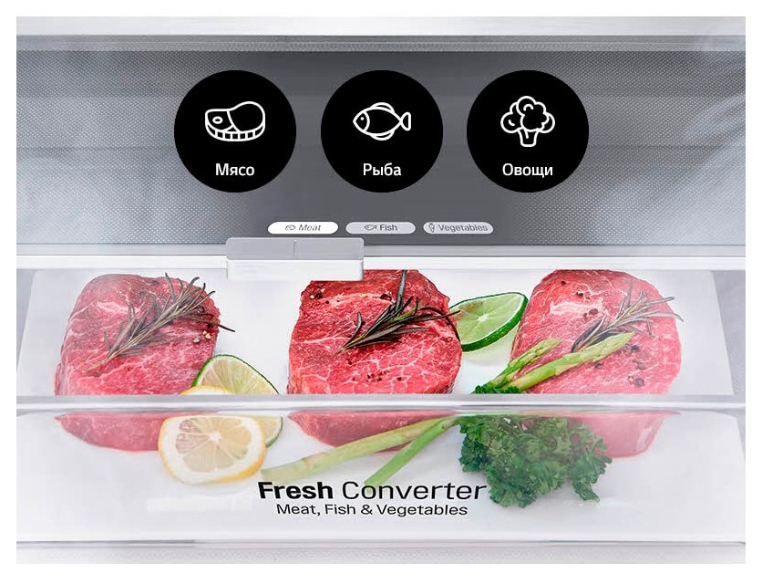 Оптимальна температура в залежності від типу продукту. FRESHConverter* являє собою технологію, що дозволяє обирати оптимальний рівень температури в залежності від типу продукту, що зберігається: м'ясо, риба та овочі.
