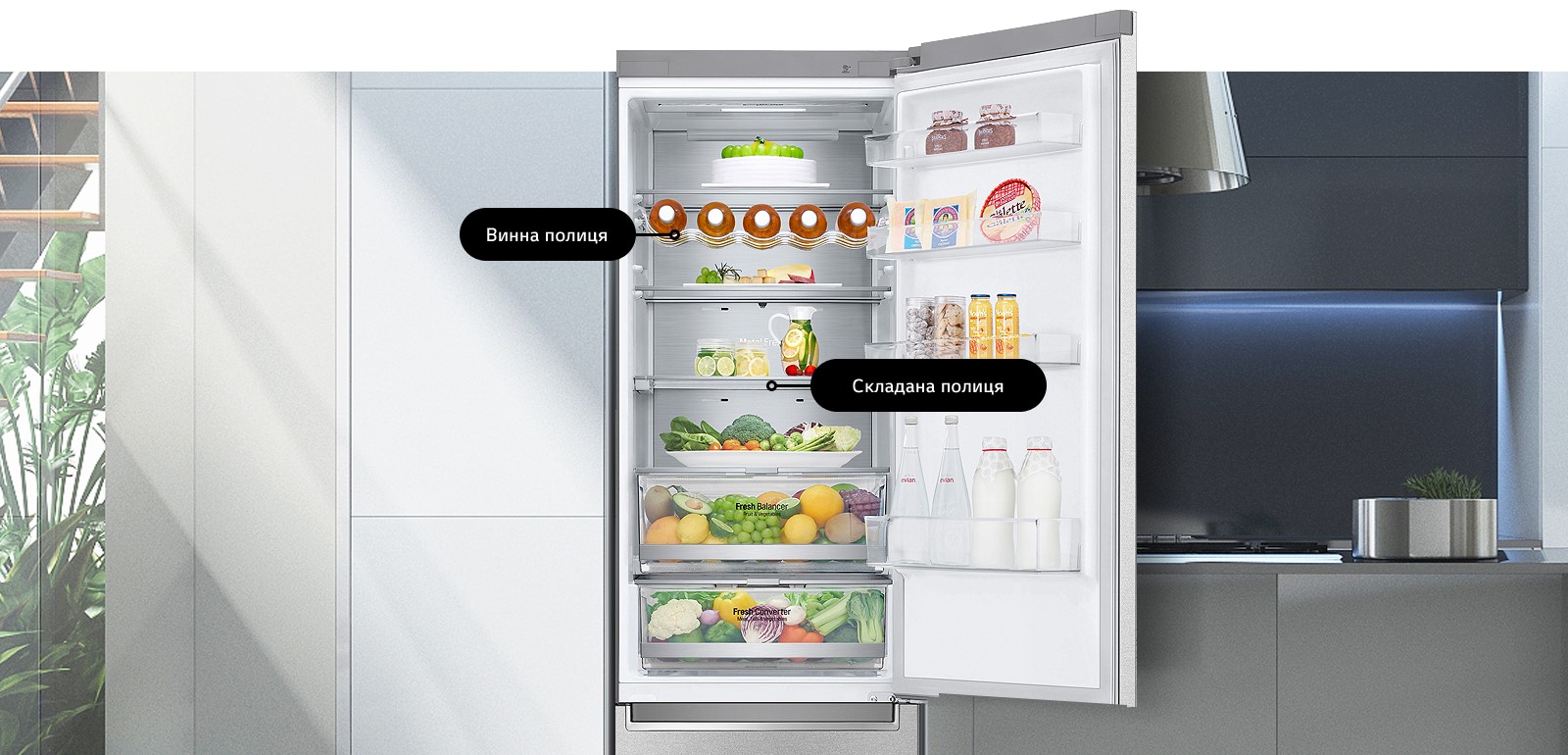 Зручність зберігання та постійний порядок у холодильнику тепер легко досяжні завдяки полиці для вина та складаної полиці у два кроки, які допоможуть економно та ергономічно організувати простір у Вашому холодильнику.