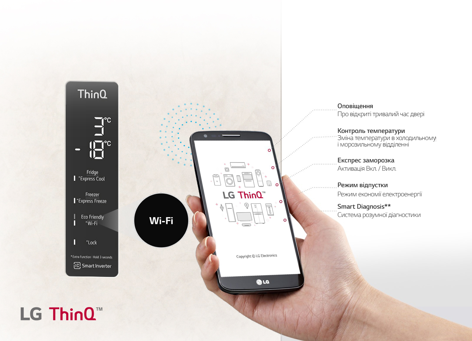 Технологія Wi-Fi c підключенням до ThinQ ™ допоможе регулювати температуру у Вашому холодильнику в будь-який час і з будь-якої відстані. Ви можете налаштувати параметри температури та контролювати Ваш холодильник за допомогою гаджетів в режимі онлайн, а також отримувати повідомлення про неполадки.