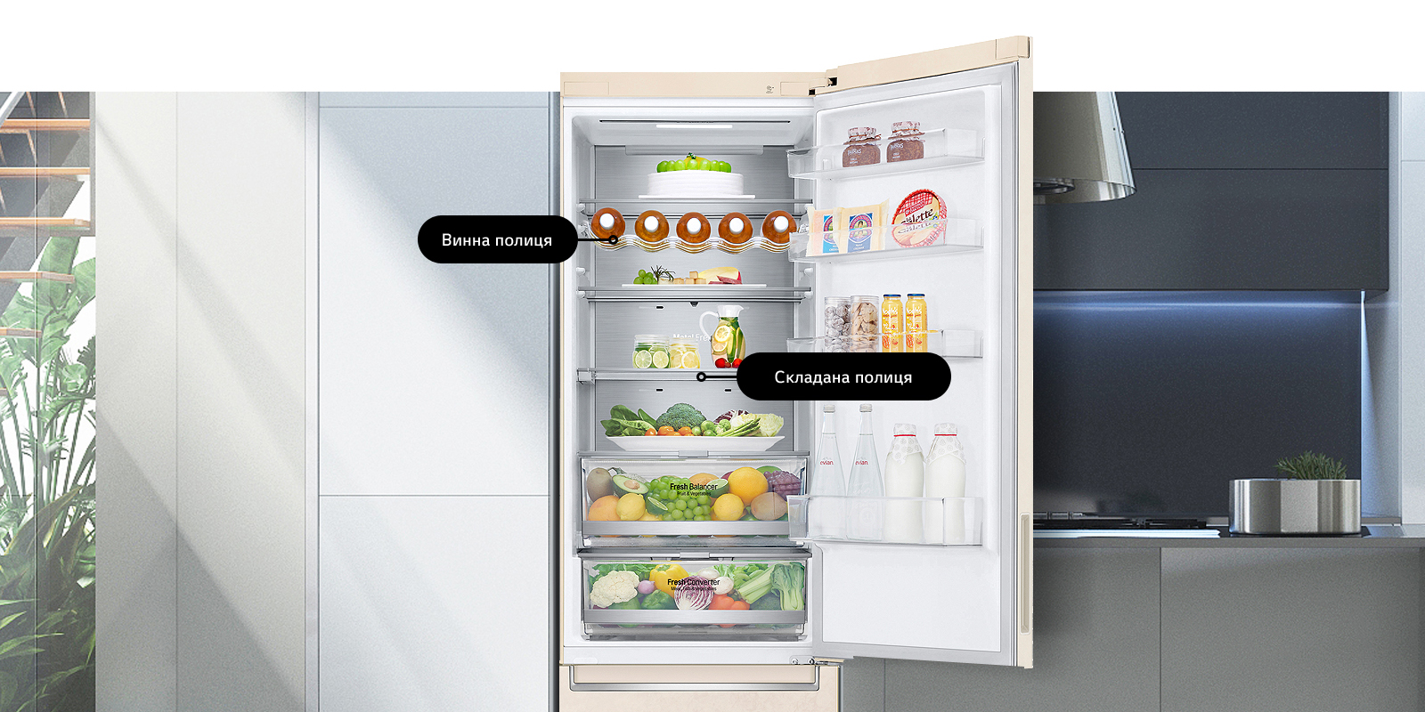 Зручність зберігання та постійний порядок у холодильнику тепер легко досяжні завдяки полиці для вина та складаної полиці у два кроки, які допоможуть економно та ергономічно організувати простір у Вашому холодильнику.
