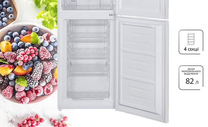 Холодильник MPM-248-FF-56 обладнаний надзвичайно практичною вбудованою морозильною камерою з 4-ма секціями, налаштованими для зручного зберігання різних продуктів. Завдяки цьому рішенню морозильна камера, розташована у верхній частині холодильника, забезпечує легкий доступ до заморожених запасів при оптимальному використанні простору.