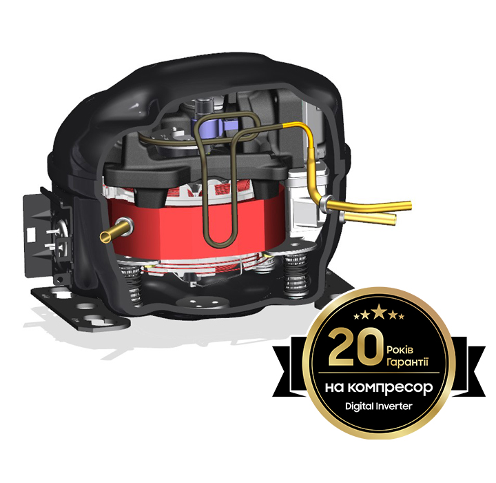 Digital InverterСучасна конструкція цифрового компресора інверторного типу забезпечує йому в чотири рази вищу інерцію, що дозволяє витрачати менше електроенергії під час роботи. Найкращий рівень споживання буде під час підтримки постійного температурного режиму. Доказом довговічності цього компресора є 20 років гарантії від виробника.
