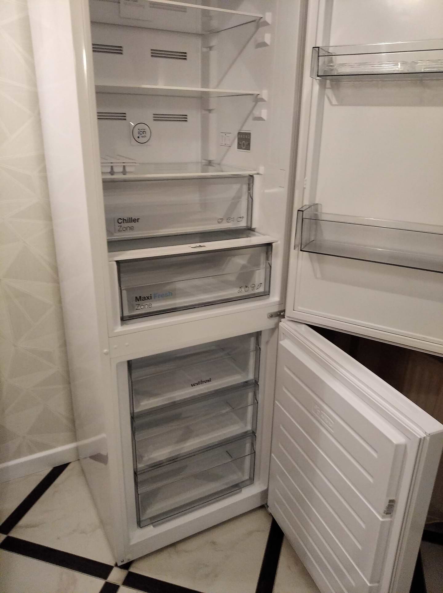 Хололдильником задоволена. Все супер! Він стильний, великий всередині, тихо працює, розташування поличок та ящичків продумані повністтю.