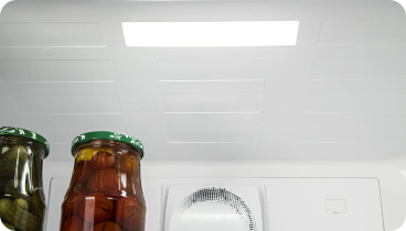 Всередині холодильника м'яке і приємне світло. Воно не сліпить очі при відкриванні холодильника вночі,і до того ж такі світлодіоди витрачають мінімум електроенергії для роботи.