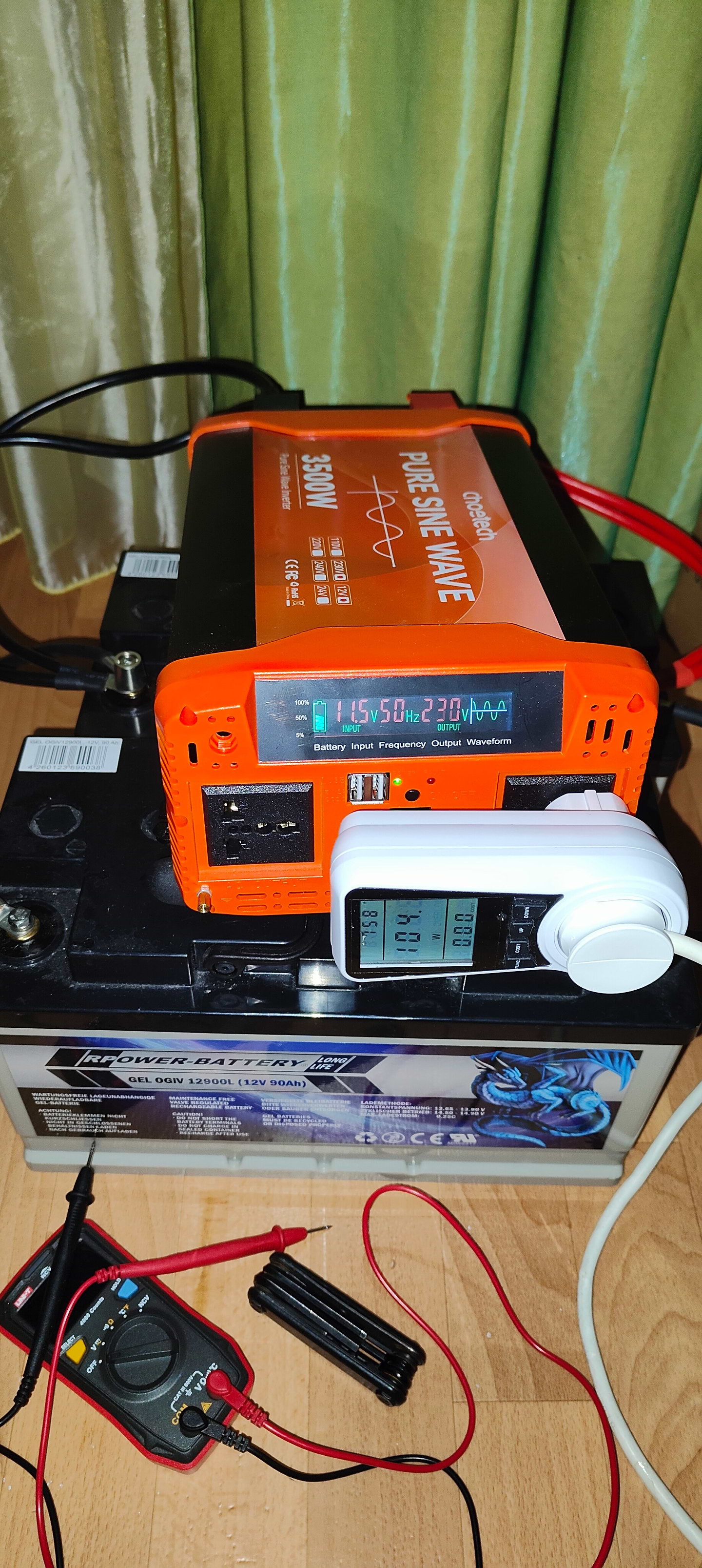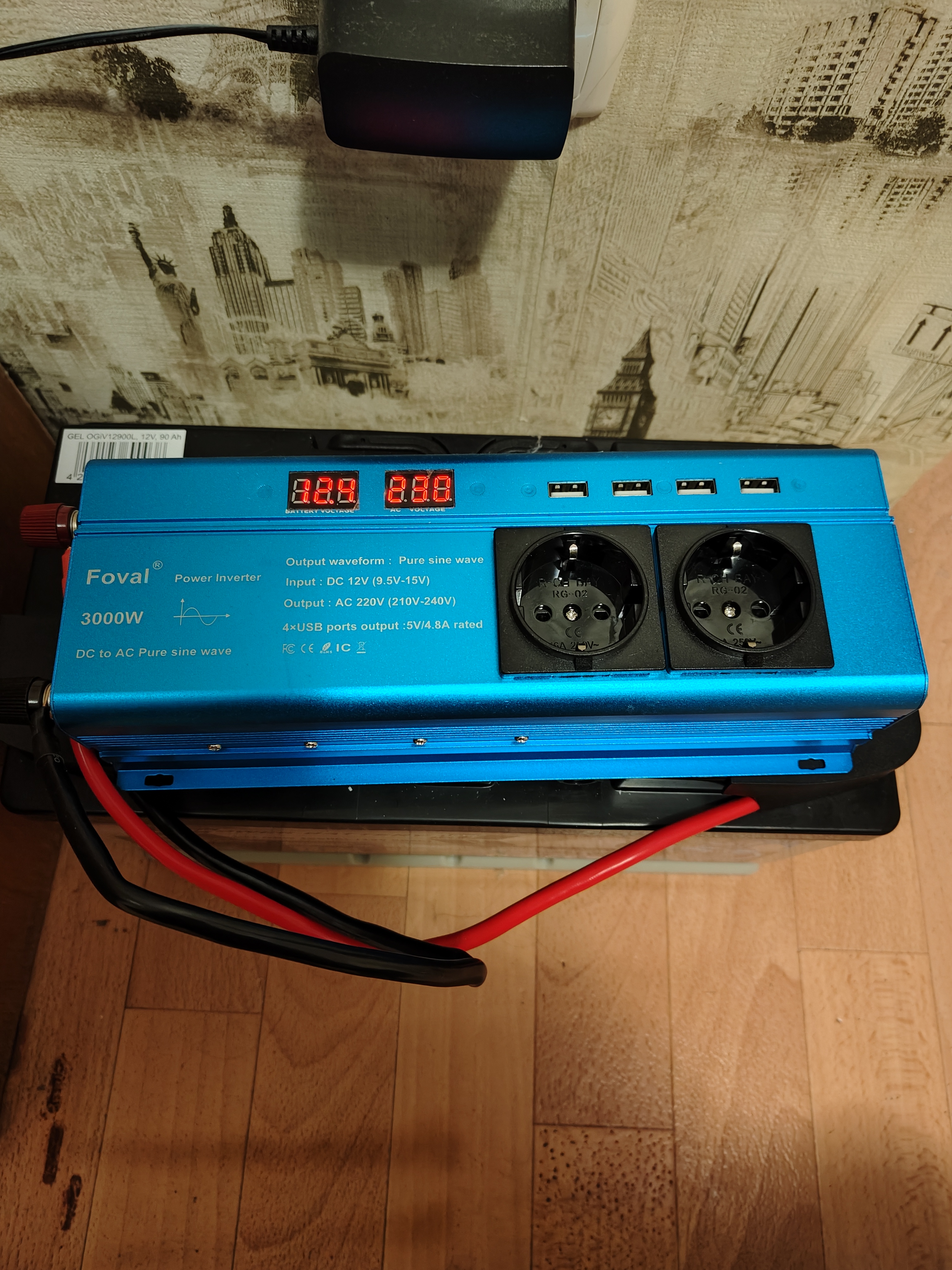 Це мій другий інвертор. Перший був foval 3000w. Але оскільки він після 750w йшов у захист, а я планував більші навантаження, то замовив цей. Інвертор підключений на два АКБ 90ah паралельно. Підключав кондиціонер і на максимальному навантаженню він споживав 1220w. Інвертор увімкнув кулер охолодження десь за 4-5 хвилин при такому режимі. Кулер працює трохи тихіше ніж в Foval. Зараз під час відключень світла підключаю інвертор і вся квартира має електрику. Зазвичай споживання 250 - 350 ват/година. В такому режимі максимально працював чуть більше як 5 годин. Ледве нагрівся. Кулер не вмикається при таких навантаженнях. Проволи живлення від АКБ до інвертора подвійні. Як підключив максимальне навантаження, то трохи стали теплі. Подобається, що є екран і на ньому всі важливі дані. Один нюанс, що інформація лише до десятих вольта. Але це важливо лише якщо у вас акуми підключені паралельно і у вас немає мультиметра для точного вимірювання. Покупкою задоволений!