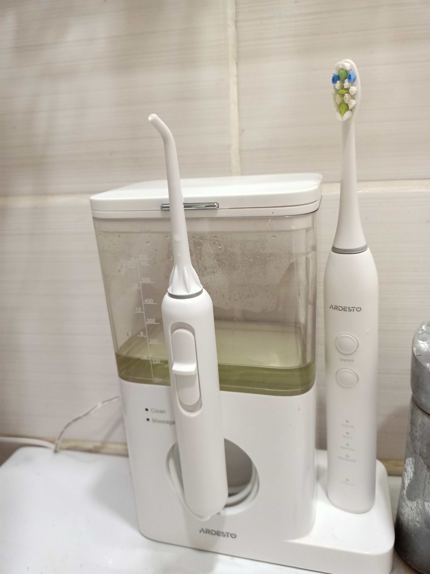 Ёмкость води 600мл>. Длинное зарядное и трубочка ирригатору. Щетка без проводная)