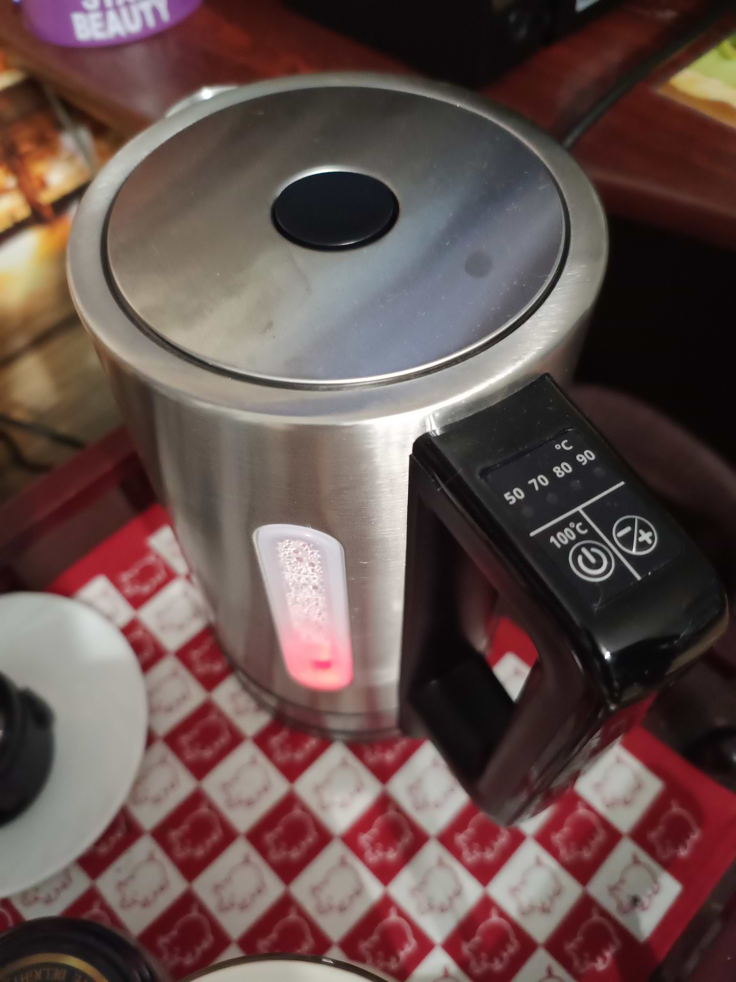 Не дуже зручно, що кнопка, яка відкриває кришку, знаходиться на самій кришці. Коли хочу перевірити, яка всередині вода (чи ще гаряча, чи треба підігріти), нажимаю кнопку, і кришка відкривається. А от коли вода гаряча, то закрити кришку і не обпекти пальця є проблемою:)))