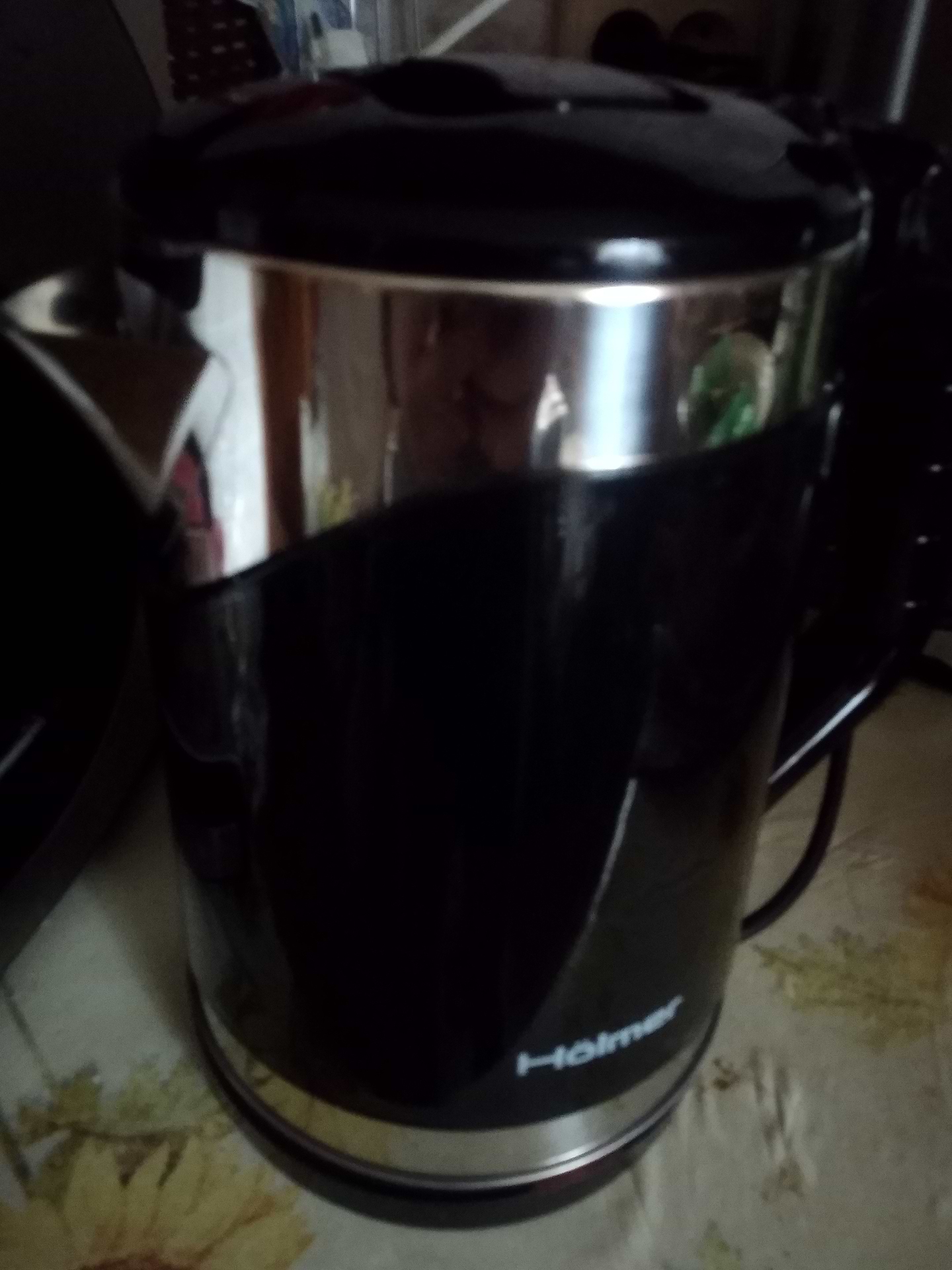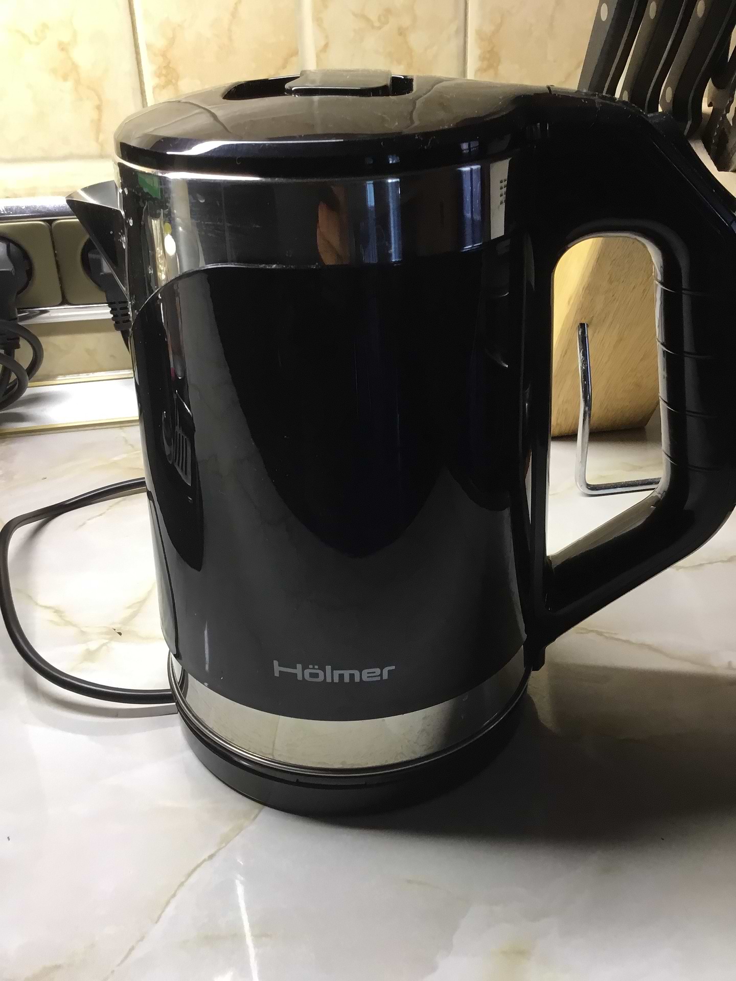 Чайник Holmer чорний - гармонійно вписався в інтерʼєр. Нема запаху пластика, сподобалося що тихо закипає