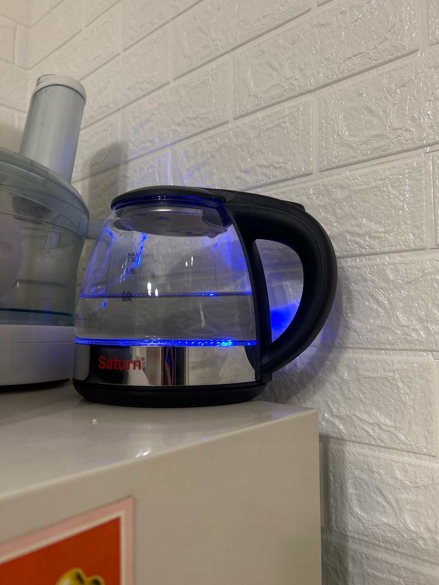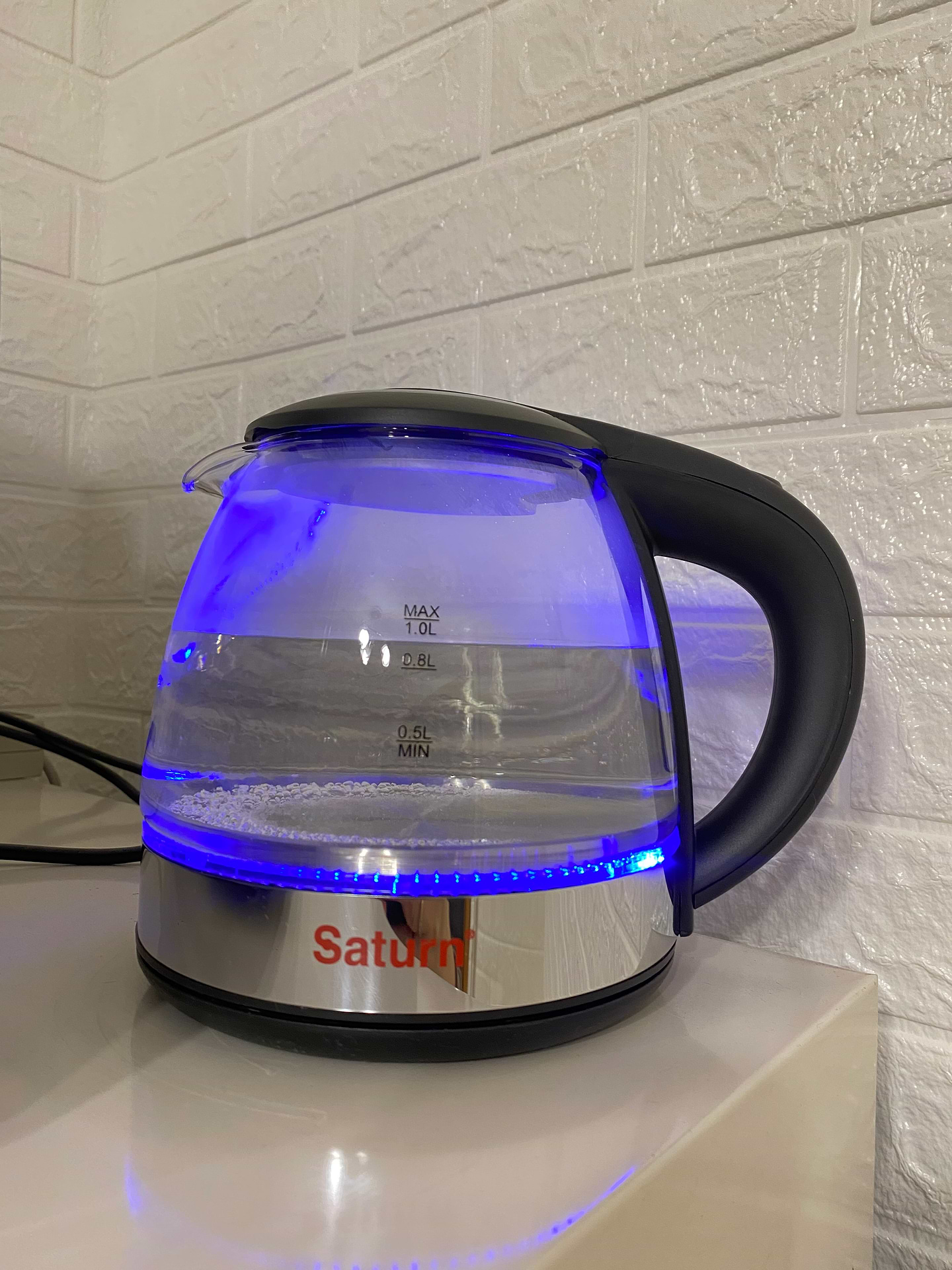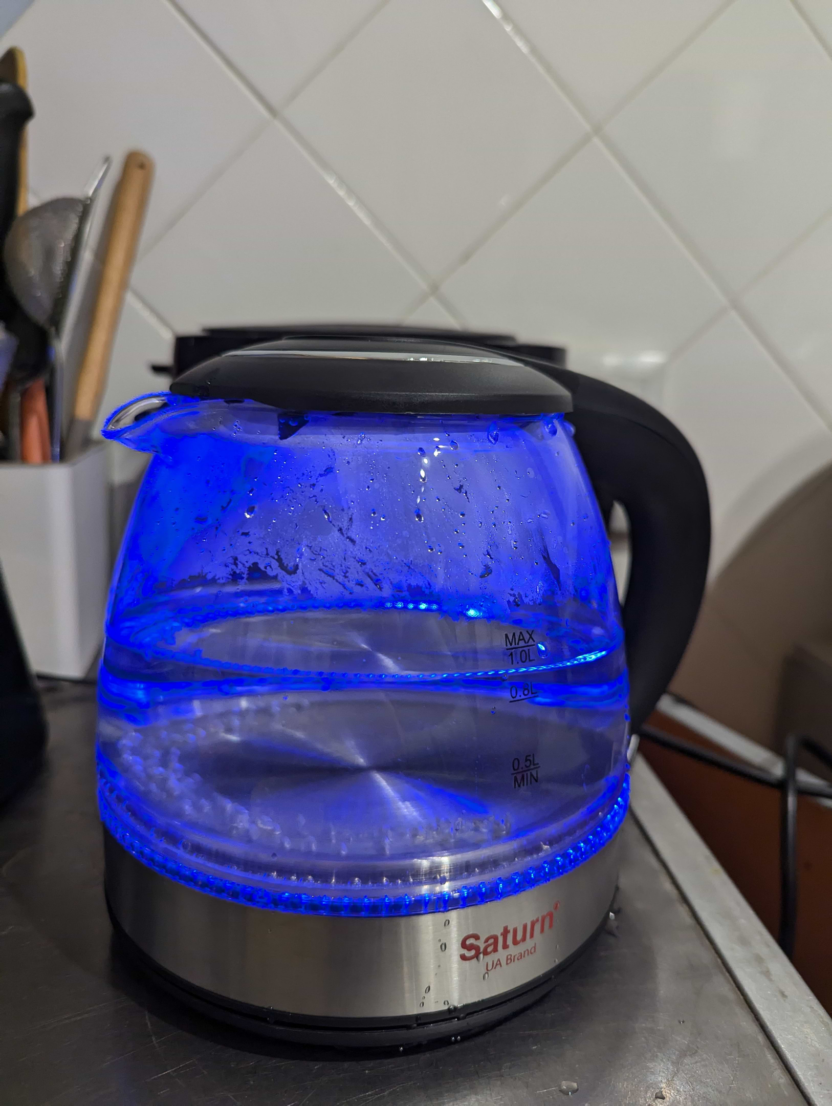 Потрібен на роботу невеликого об'єму чайник. За розміром і ціною вибір припав на Saturn. 800 мл нагрів за 4 хв. І ще близько хв просто кип'ятив воду. З кнопки вкл/вкл пішов пар і таки чайник таки вимкнувся. Однозначно техніку лишати без нагляду не можна. Доведеться самій вимикати як закипить бо довго не протягне...