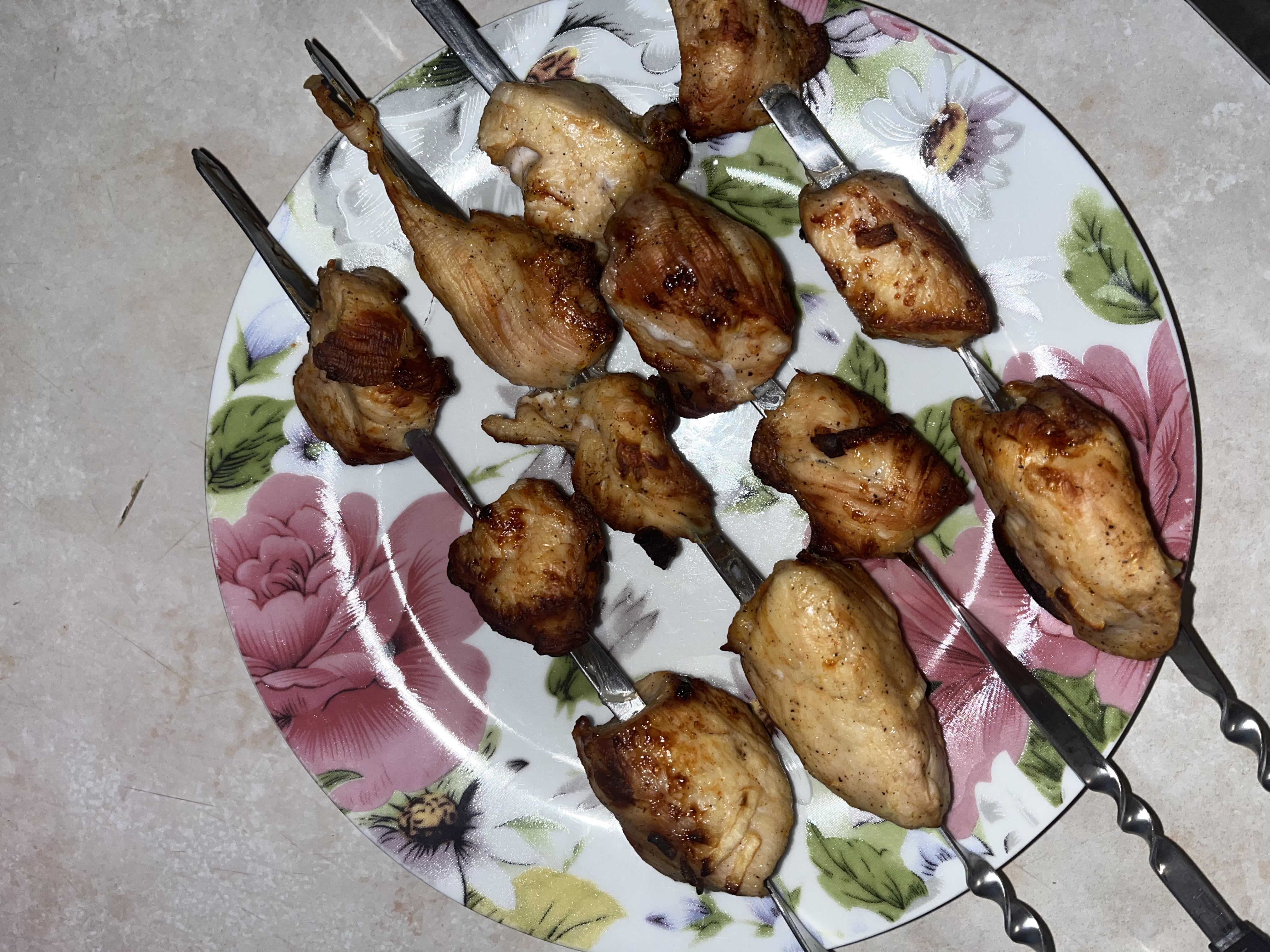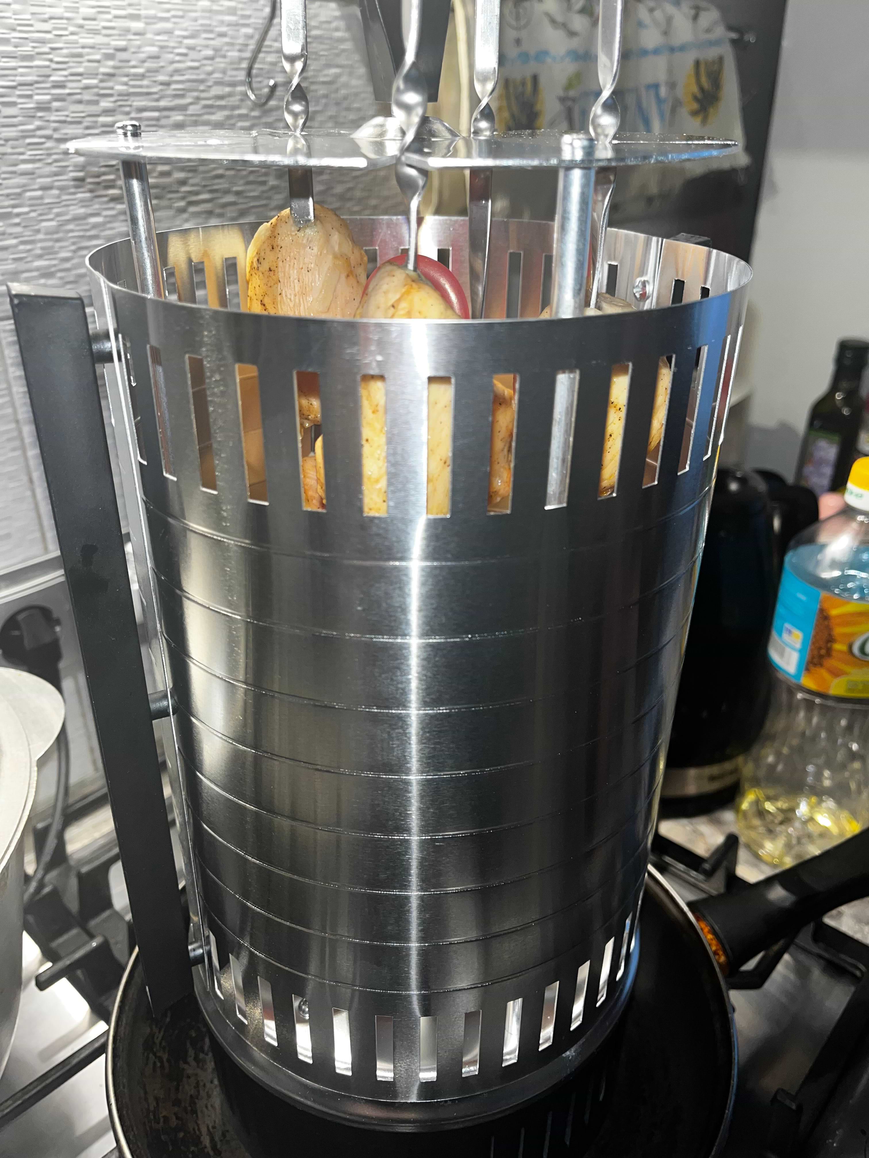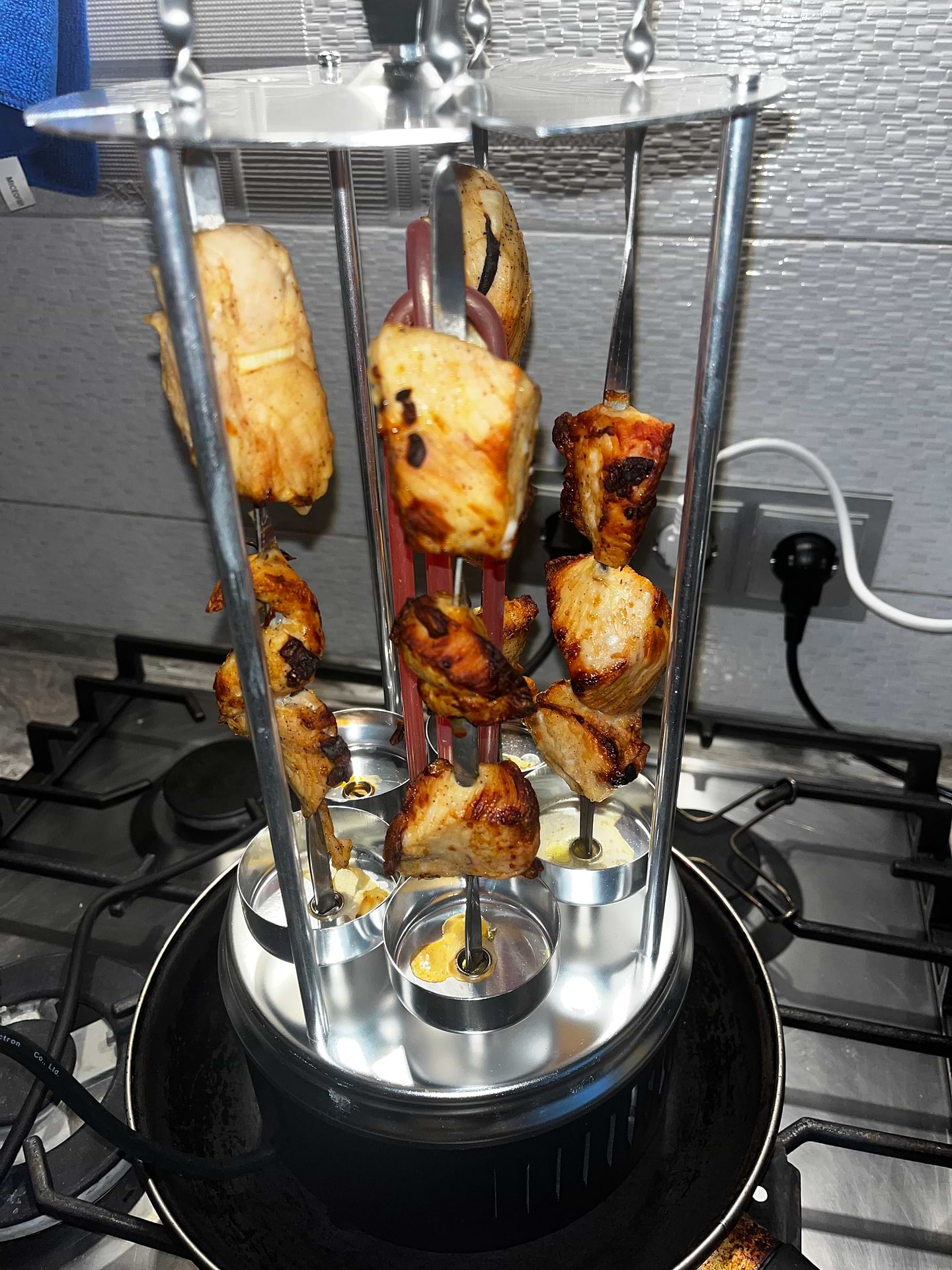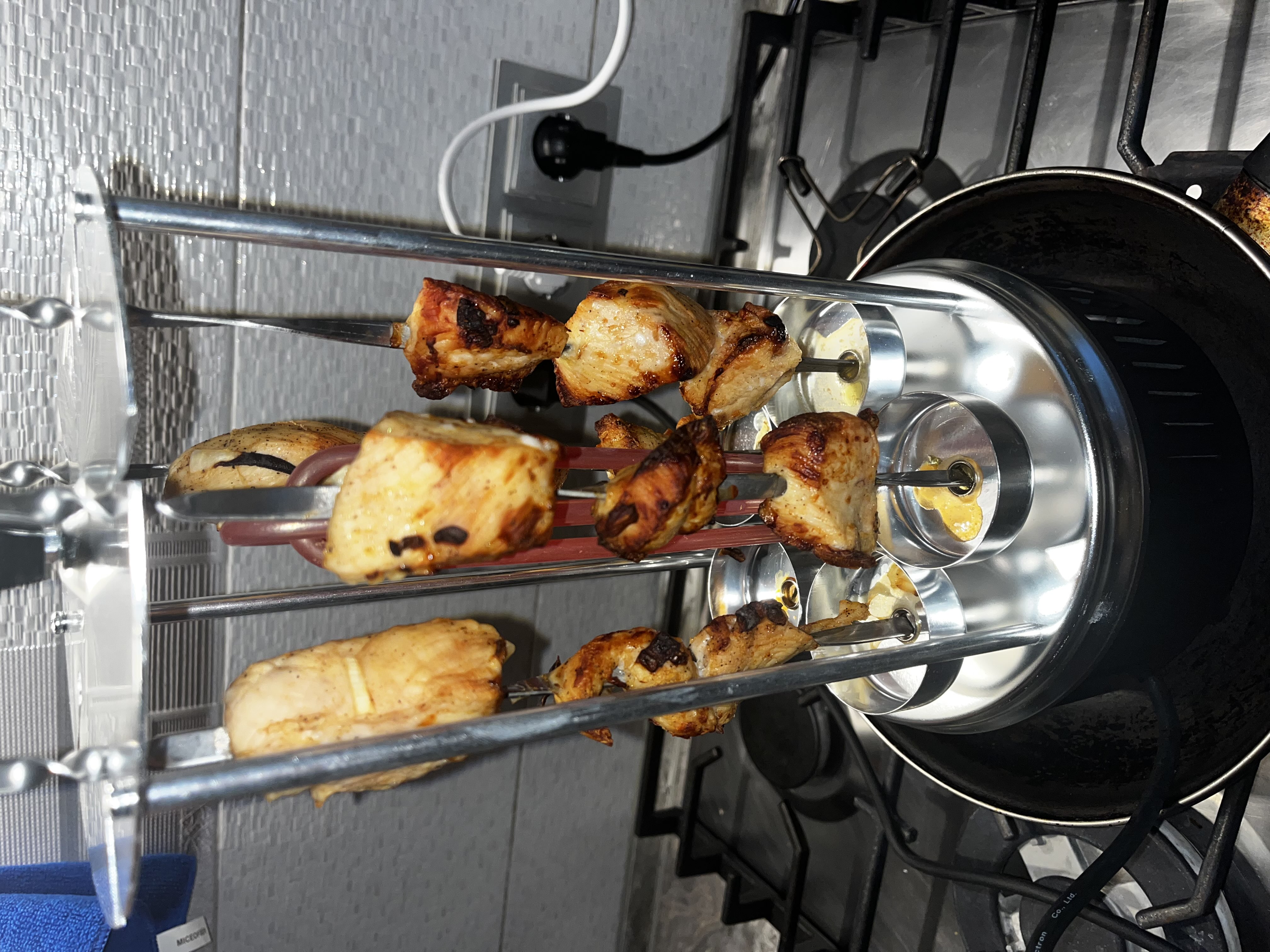В процессе жарки мясо опускается в низ по шампуру,- верхние кусочки румяные нижние белые- мы нашли выход, минут через 25 готовки просто вилочкой подтянуть кусочки верх по шампуру. После чего они начинают равномерно жарится.