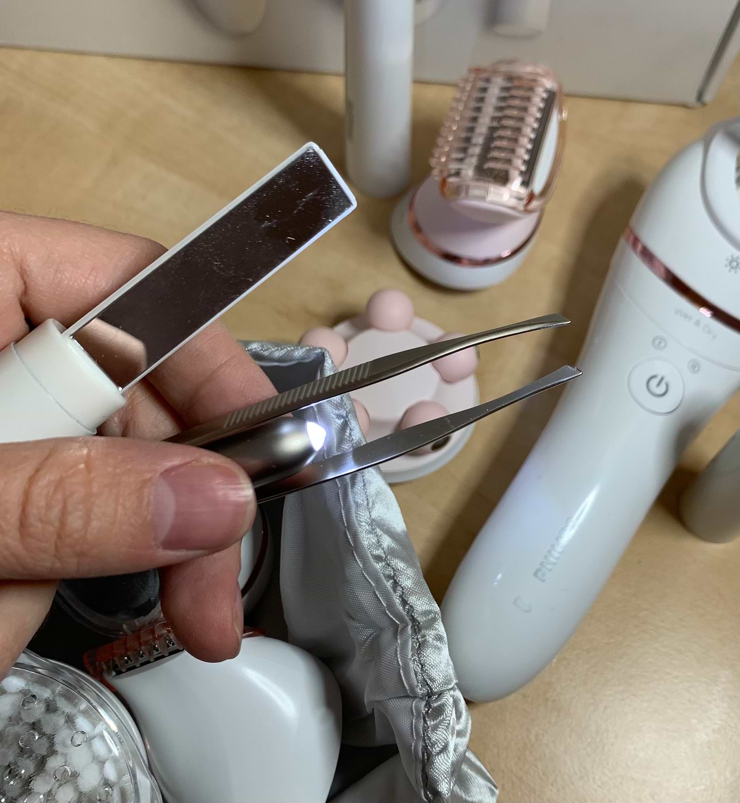 Дуже сподобався пінцет із дзеркалом та підсвіткою. Є тример для обличча. Сам епілятор дуже добре видаляє волосся і зовсім не боляче. Можна зробити масаж та пілінг завдяки насадкам. І все ці процедури не виходячи з дому. Швидко та зручно