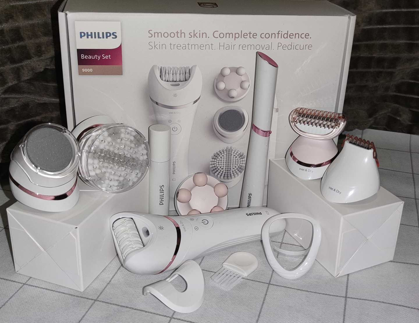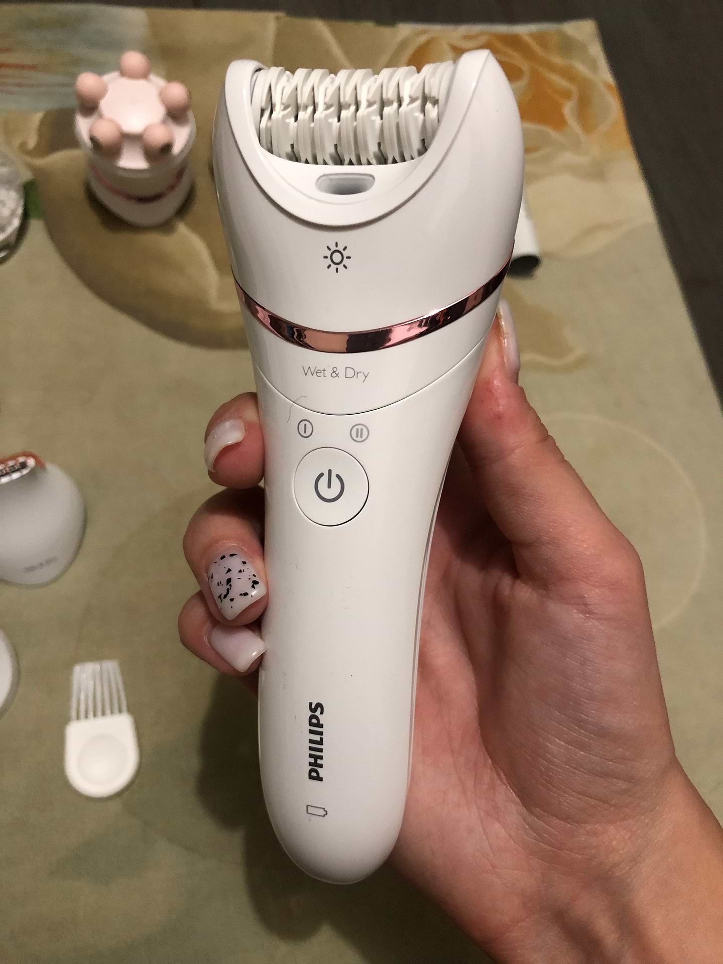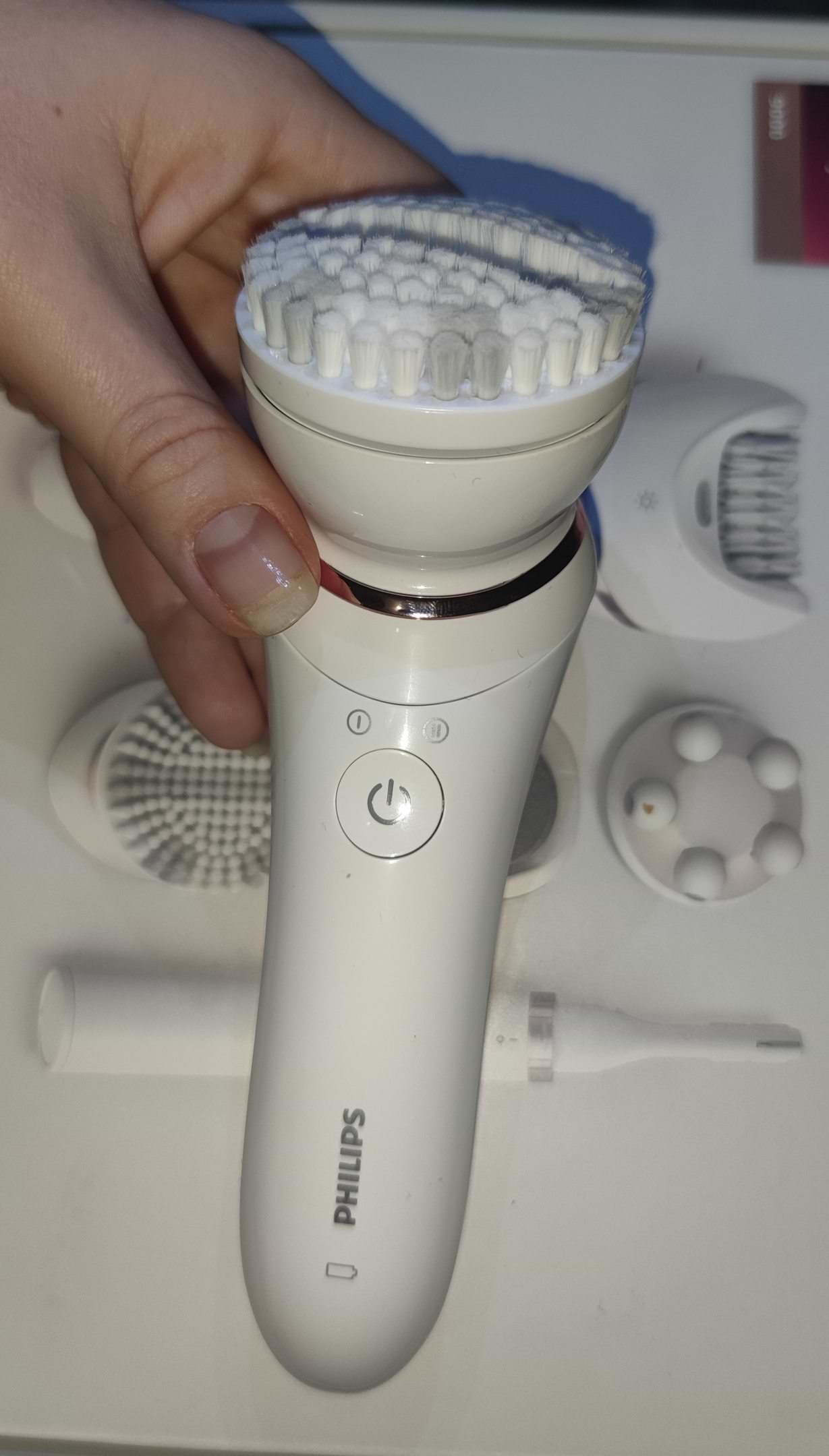 Комплектація мене вразила. Є насадки для догляду за всім тілом. Улюблена насадка тепер це шліфувальна пилка, видаляє загрубілу шкіру за один прохід. Дві швидкості, є підсвітка і працює від акумулятора.
