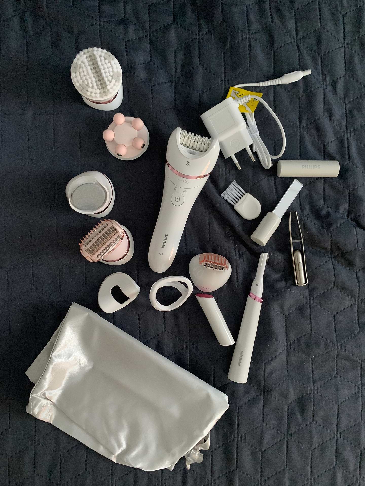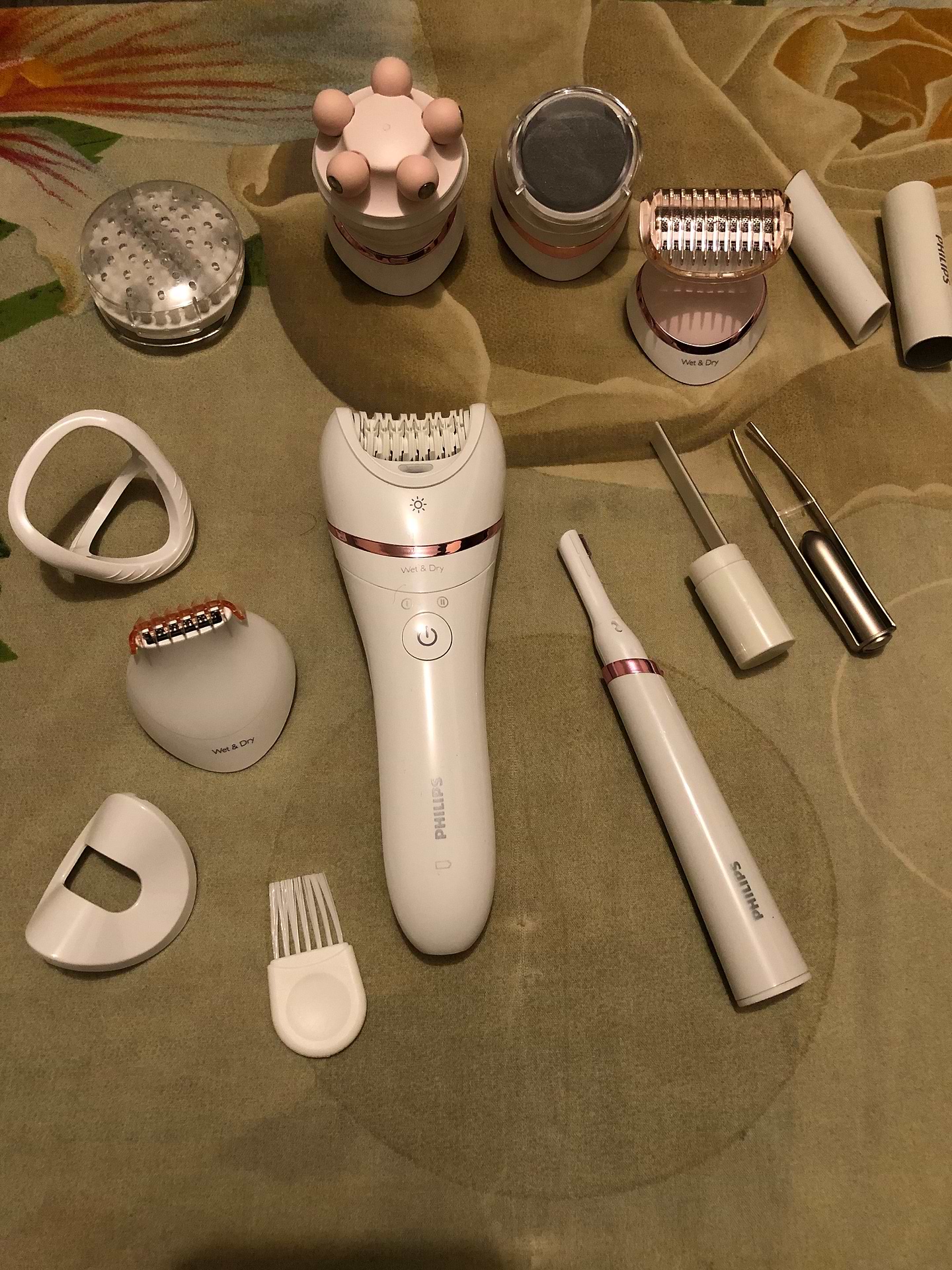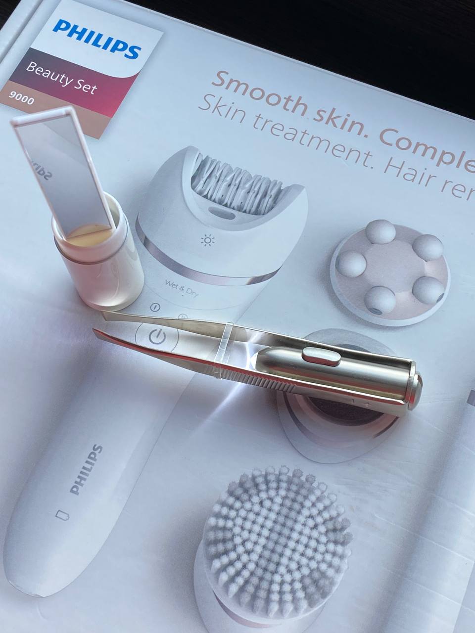 Очень понравился комплект. Все насадки работают, легко снимаются и крепятся без особых усилий. Все можно мыть. Эпилятор удаляет волосы быстро и эффективно. Для меня было удобнее проходить длинные участки тела короткими отрезками. Щетинки на насадке для пилинга хорошо держат форму. Пинцет для бровей удобно брать с собой. Выглядит как помада, но на самом деле это футляр-зеркальце. Еще я успела попробовать насадку-шейвер. Так же прекрасно выбривает там где это необходимо и без ран. Я довольна.