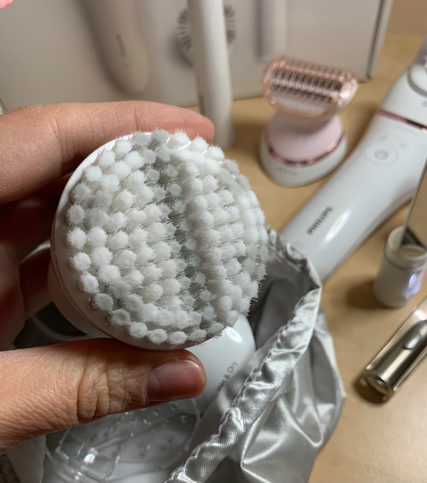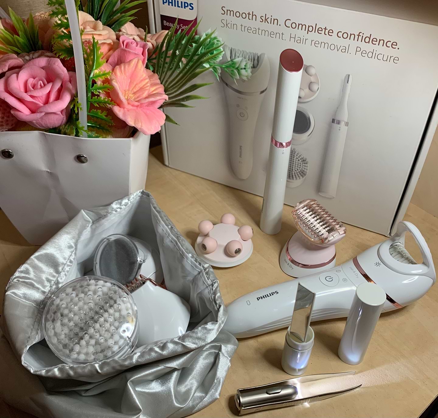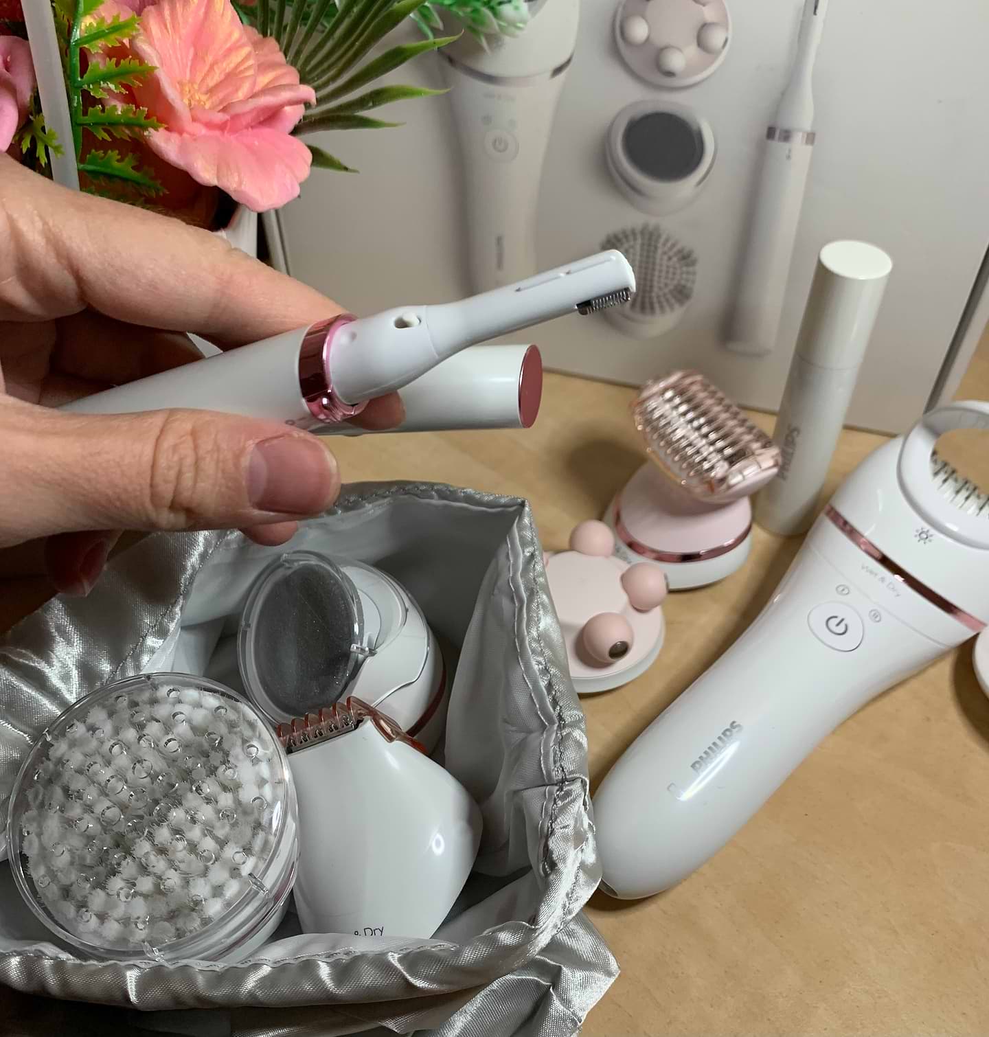 Очень понравился комплект. Все насадки работают, легко снимаются и крепятся без особых усилий. Все можно мыть. Эпилятор удаляет волосы быстро и эффективно. Для меня было удобнее проходить длинные участки тела короткими отрезками. Щетинки на насадке для пилинга хорошо держат форму. Пинцет для бровей удобно брать с собой. Выглядит как помада, но на самом деле это футляр-зеркальце. Еще я успела попробовать насадку-шейвер. Так же прекрасно выбривает там где это необходимо и без ран. Я довольна.