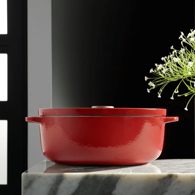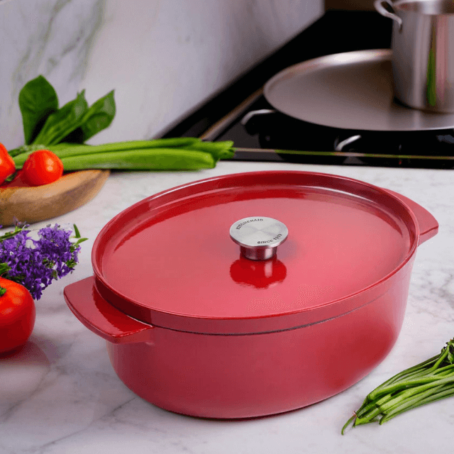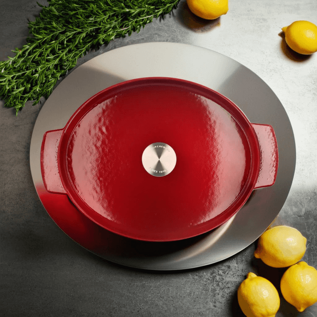 Завдяки чавунній конструкції тепло рівномірно розподіляється, дозволяючи готувати страви з насиченим смаком і соковитою текстурою. Герметична кришка утримує вологу та аромати, створюючи ідеальні умови для приготування тушкованих страв – м’яса, птиці або овочів. Вона стане незамінною як для повсякденних страв, так і для святкових вечерь.
