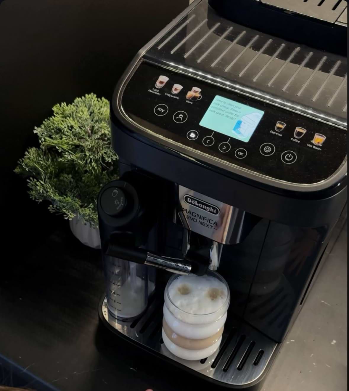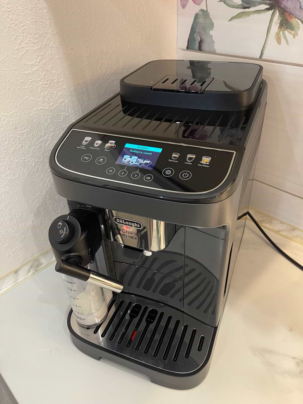 дуже довго обирали між даною кавомашиною і philips late go. Зупинились на даній можелі і дуже задоволені. Гарна, сучасна, ідеально вписалась в інтерʼєр. Каву робить дуже смачну. Є 3 профілі користувача де можна каву налаштувати під себе на кожного члена родини. Є функція використання меленої кави. Машинка розказує що і як зробити, нагадує щоб поставили ємність для молока в холодильник. Є функція подачі гарячоі води, нас теж сподобалось, оскільки малому на дитячу суміш тепер набагато швидше нагріває воду саме кавомашина, а не чайник. Однозначно рекомендую!