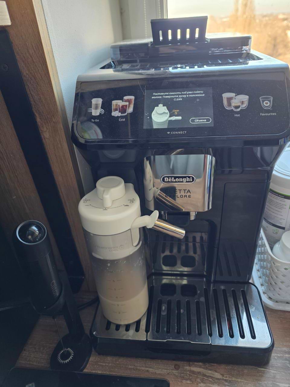 Больше всего меня покорило, что здесь два отдельных молочника: один для горячих напитков, второй для холодных. Хочешь латте или капучино — пожалуйста, хочешь айс-латте или фраппе — тоже без проблем. Плюс в комплекте есть формы для льда, и это такая мелочь, но делает холодные напитки реально как в кафе.