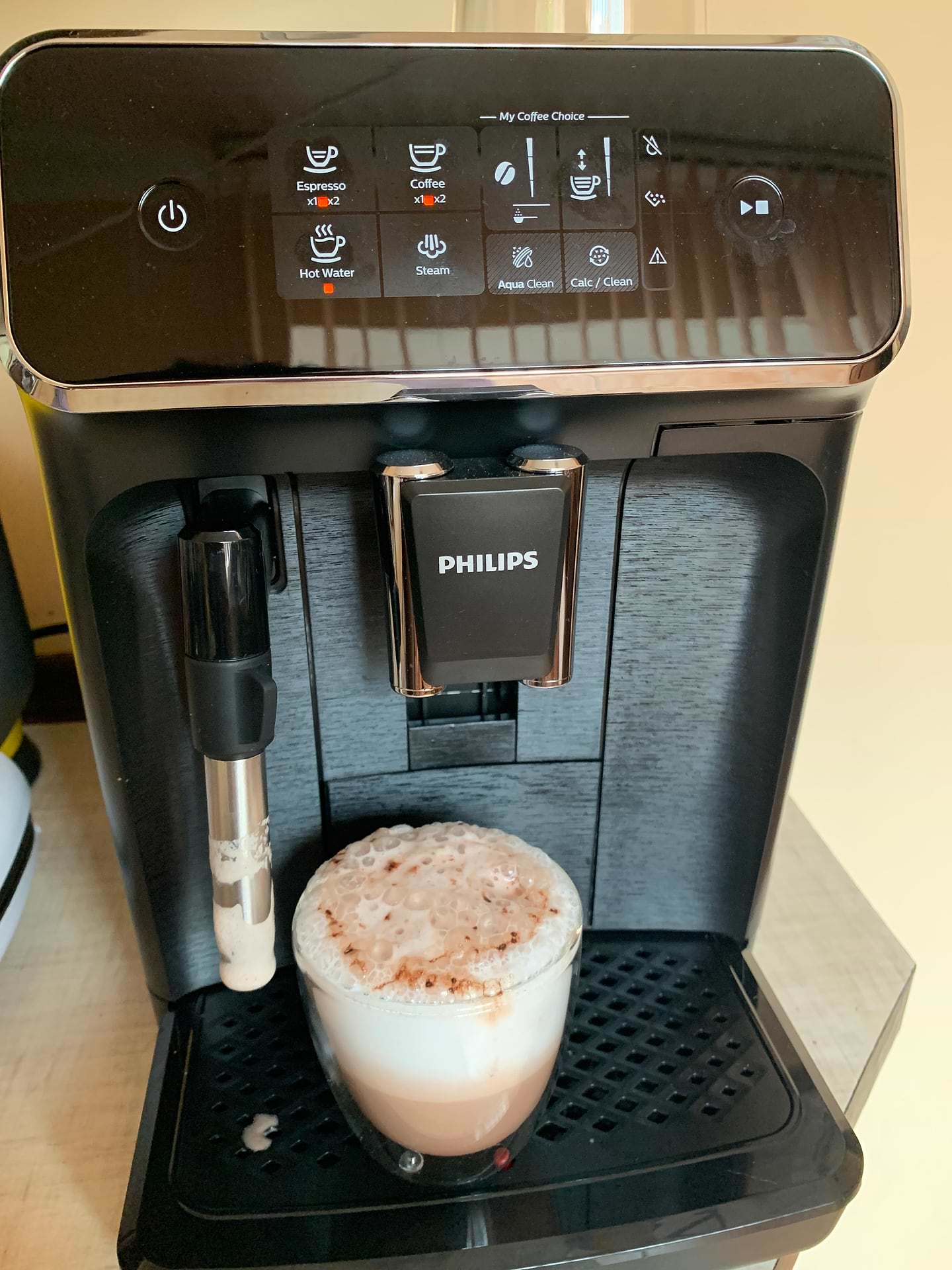 Товар сподобався! Спочатку мені запропонували іншу модель, але прослухавши мої побажання, зробила вибір саме на цій моделі. Мені подобається ніжна і густа пінка, яку робить капучинатор. Я дуже люблю какао. Кофе експресо готується з пінкою, що також не може порадувати! Окремо є подача гарячої води! Що також можна зробити чай не залучаючи чайника! Латте і Капучино роблю сама за бажанням кріпості та кількості молока. Для мене саме це було важливо у виборі машини та приготуванні улюблених напоїв! Ще дуже було приємно отримати подарунок від магазину -фірмові стакани Philips. Дякую консультантам магазину Маріані та Олександру за саме цей вибір!