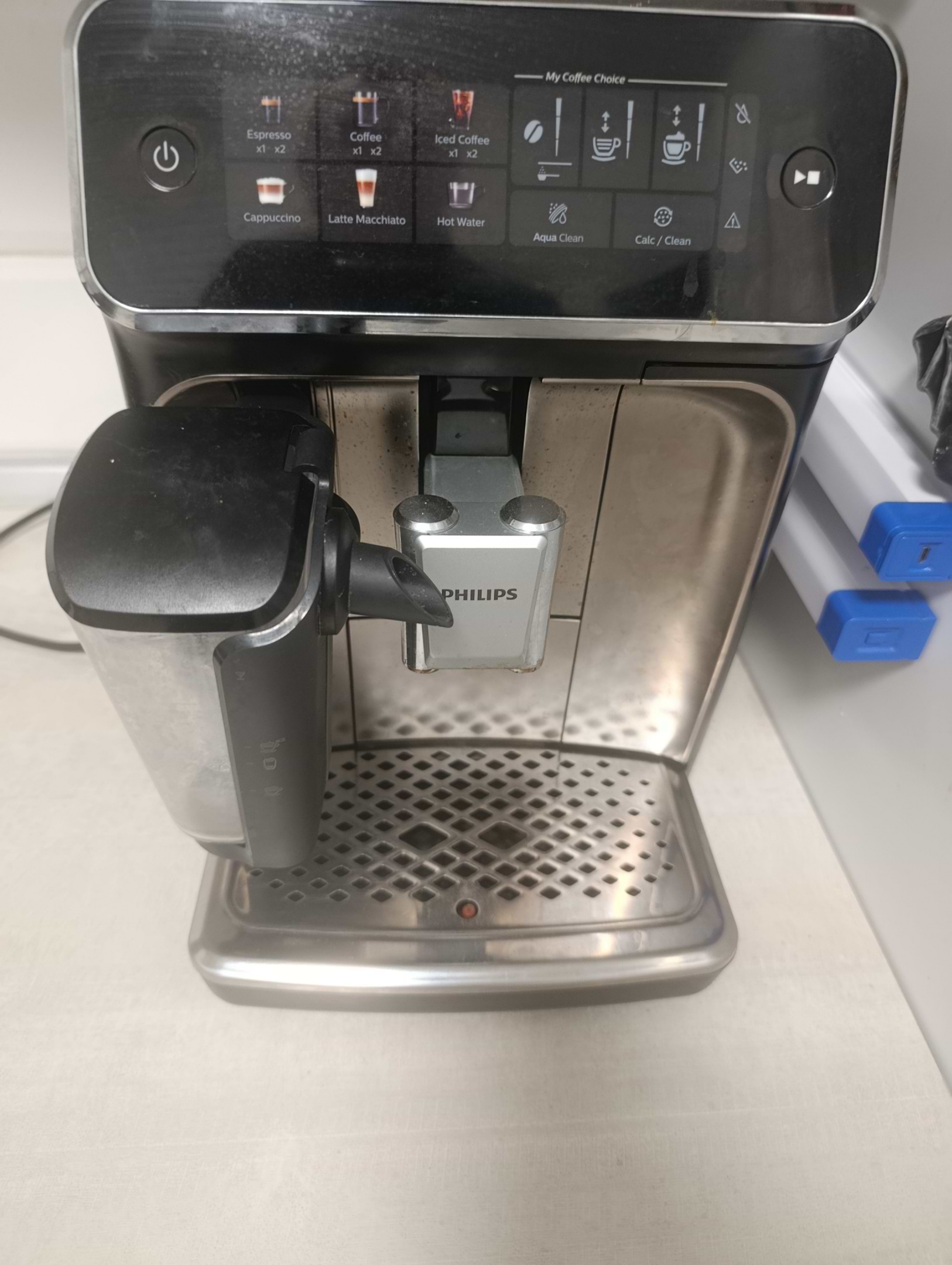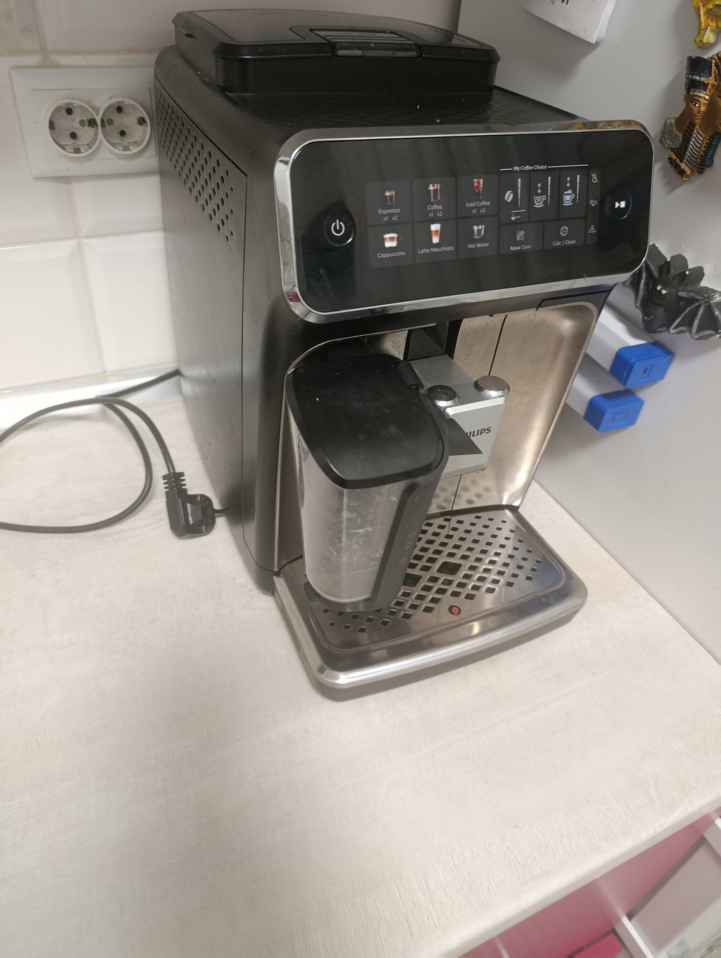 Единственный минус, как для меня, не показывает, что заканчивается кофе (покажет уже только когда и сам пойдёшь, что его нет) и второе - просит долить воды, когда ещё в резервуаре достаточно вода как минимум на две чашки кофе...