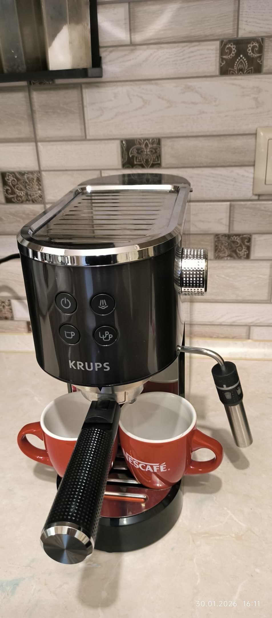 Крихітна, якісна і знає собі ціну. Працює швидко завдяки нагрівальному елементу, кава вже готова за менш ніж хвилину. Є спінювач молока, то хто любить каву з молоком, то може себе порадувати. Гарний дизайн, та чудова якість це все в компактній кавоварці. Рекомендую.
