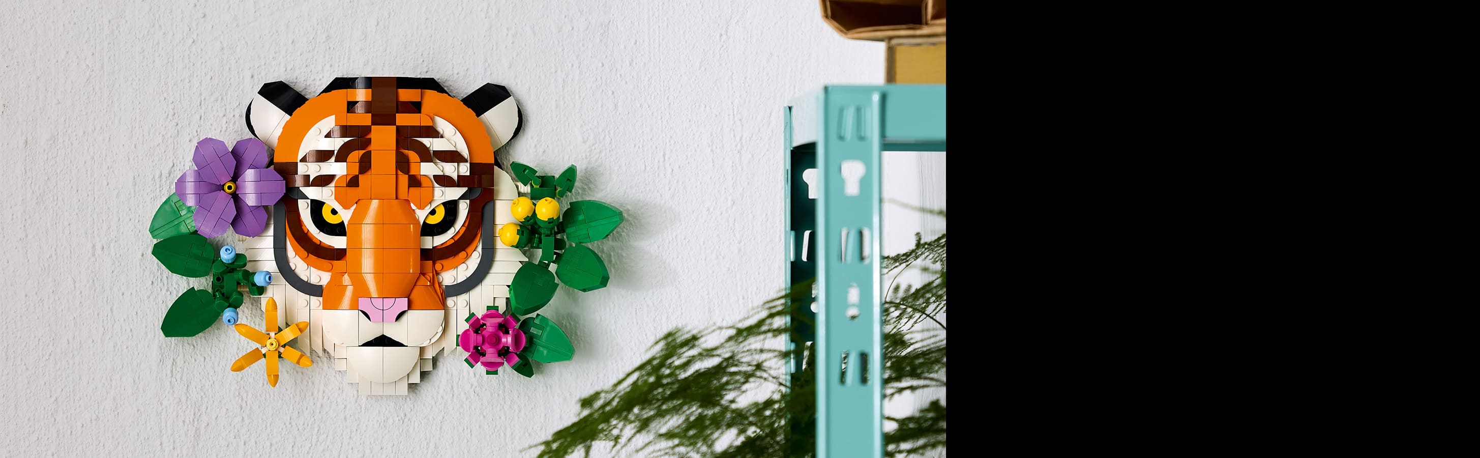 Додайте трохи барв у свій дім за допомогою цієї моделі LEGO® Art, що зображує тигра, який визирає крізь декоративні квіти та рослини.