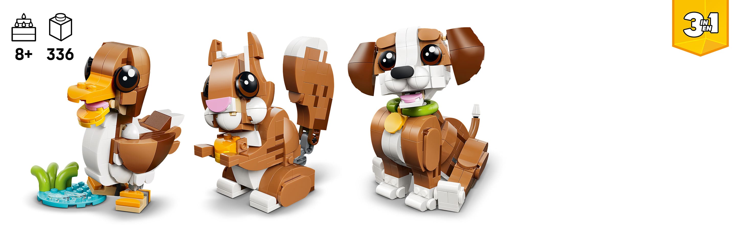 Любителі тварин можуть скласти цей набір LEGO® Creator 3 в 1 Милі тварини: Грайливе цуценя, а потім перебудувати його на іграшкову білку або качку.