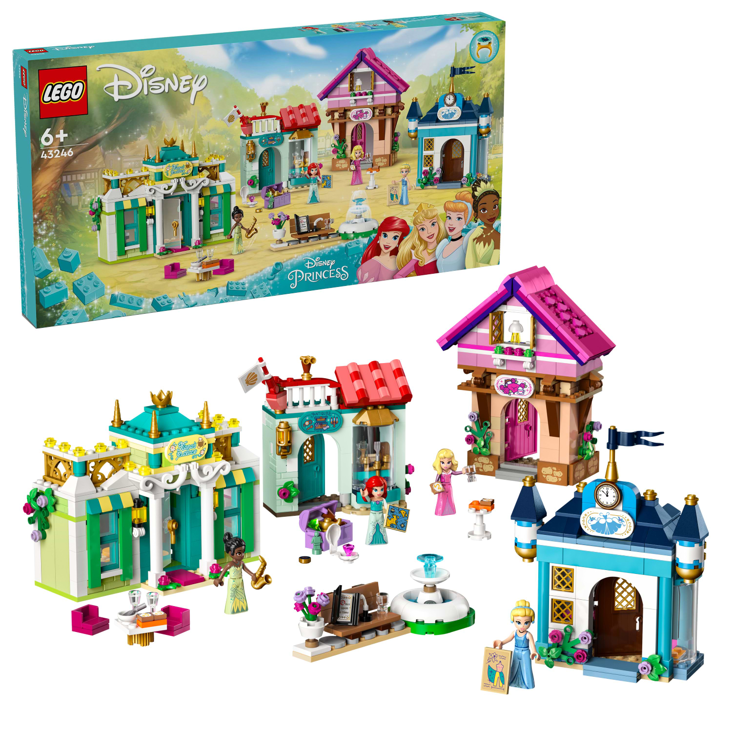 одна з яких має невелике місце для зберігання на даху, а також невелику модель із вазоном, лавкою та фонтаном. До набору також входять фігурки мініляльок LEGO ǀ Disney Тіани, Аврори, Попелюшки й Аріель, а також дві колекційні каблучки